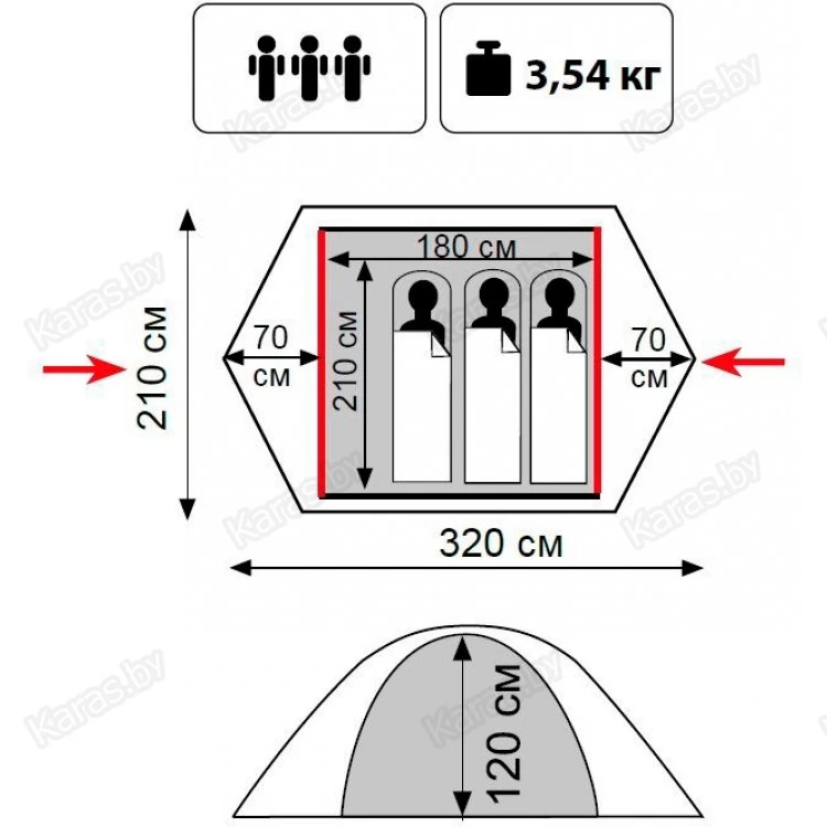 Модель отлично вентилируется благодаря 2 симметрично расположенным большим входам палатку и системе вентиляционных окон.