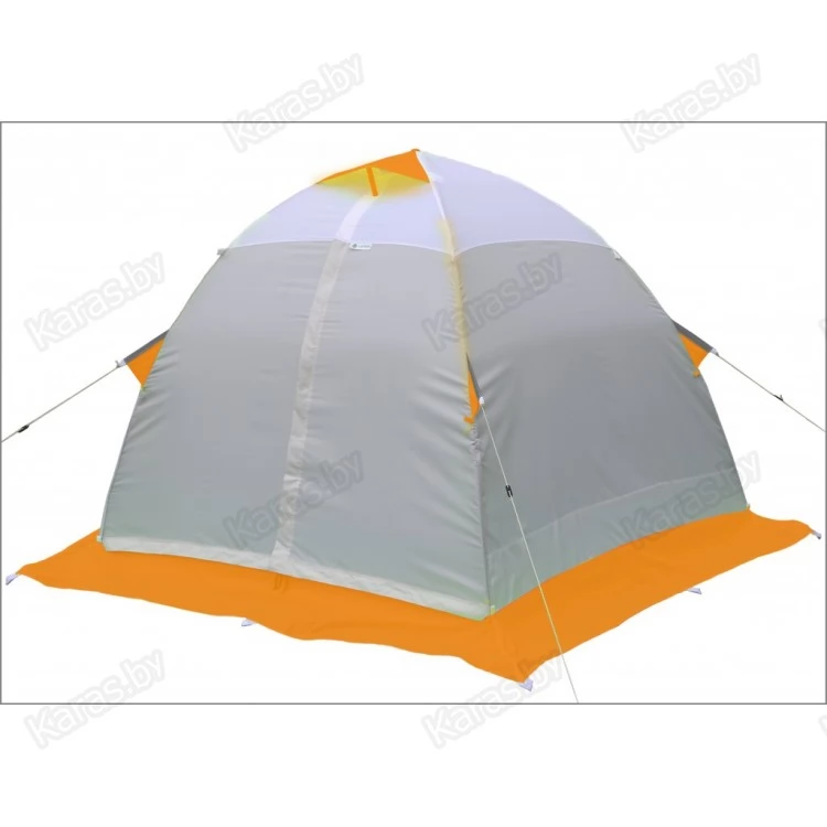 10) Вход в палатку имеет максимально-удобную, с практической точки зрения конструкцию, которая выполнена в виде перевернутой Т-образной формы. Такая форма двери позволяет ей максимально широко раскрываться, приоткрывать дверь снизу, для регулировки притока воздуха, открывать только одну половину двери и сохранять при этом тепло в палатке. При этом в конструкции входа используются три двойных самостоятельных замка №10 на молнии Т10, высокой надежности. С наружной стороны молнии входа защищены широкими ветрозащитными планками, усиленные материалом ПВХ, для предотвращения закусывания при застегивании. Эти планки надежно защищают молнию от попадания снега и от обмораживания.