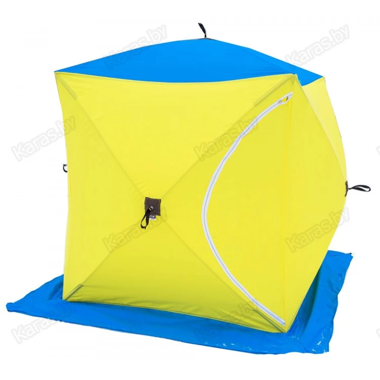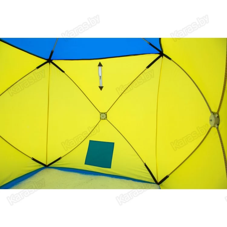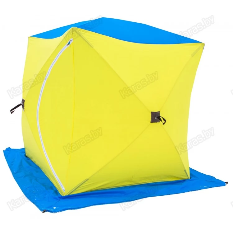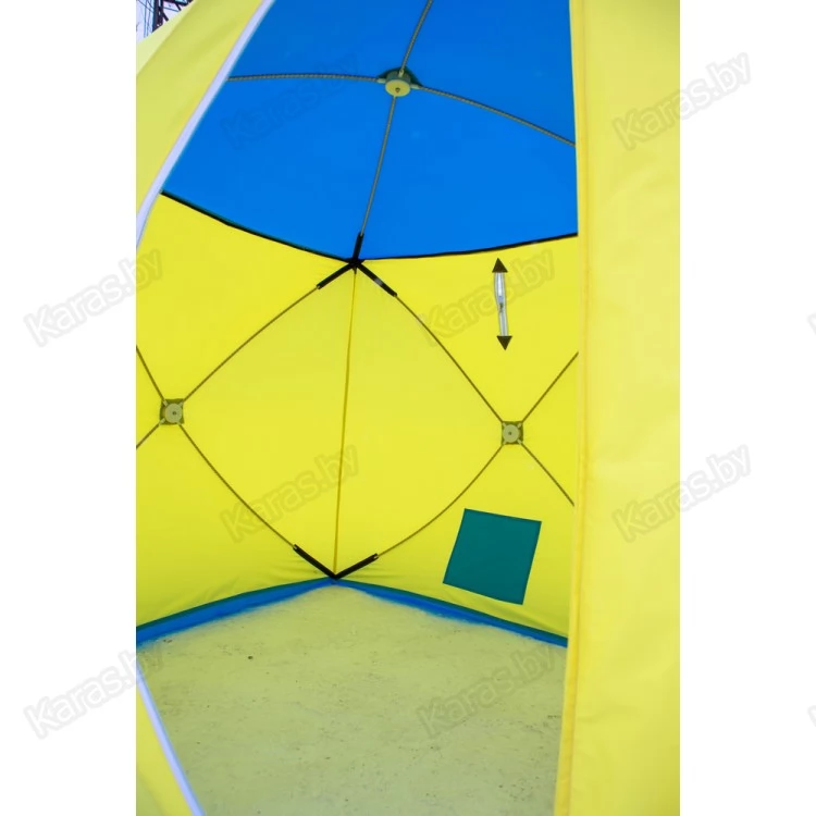 Прочный каркас палатки выполнен из фибергласса (стеклопластик) и обеспечивает сохранение кубической формы даже при сильном ветре. Прочная водостойкая непродуваемая ткань тента (нейлон 300D) надежно защитит от ветра и атмосферных осадков. Тент палатки выполнен из ткани, которая позволяет пропускать дневной свет во внутрь палатки, благодаря чему рыболов имеет возможность ловить рыбу в дневное время без подсветки дополнительными осветительными приборами. Вентиляционное окно закрывается на молнию. Снаружи расположена сплошная ветрозащатная юбка.