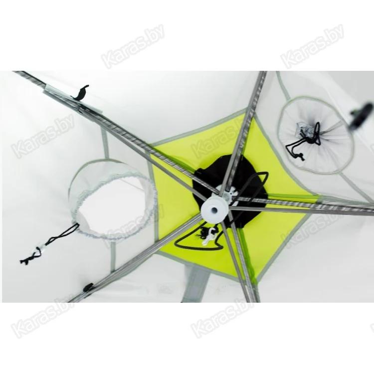 - Окраска палатки выполнена в ярко-салатовом цвете, и даже в самый пасмурный день в ней будет всегда светло и уютно. Для безопасности в ночное время предусмотрены светоотражающие окантовки ребер и растяжки.