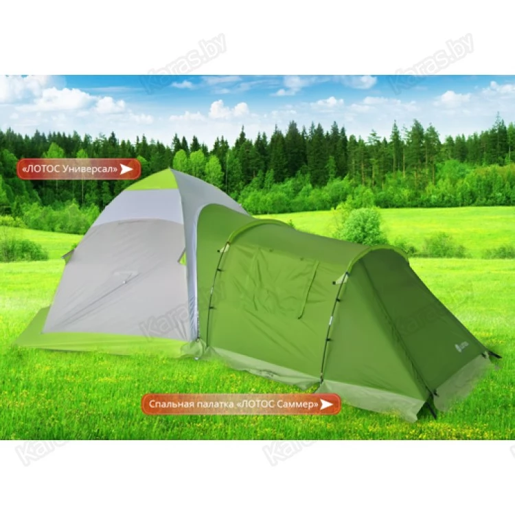 D/образный вход снабжен специальной тракторной молнией, и является унифицированным элементом, к которому могут крепиться другие модульные палатки при помощи «Соединения» , а также прочие конструкции, например Спальная палатка «ЛОТОС 3 Саммер» .
