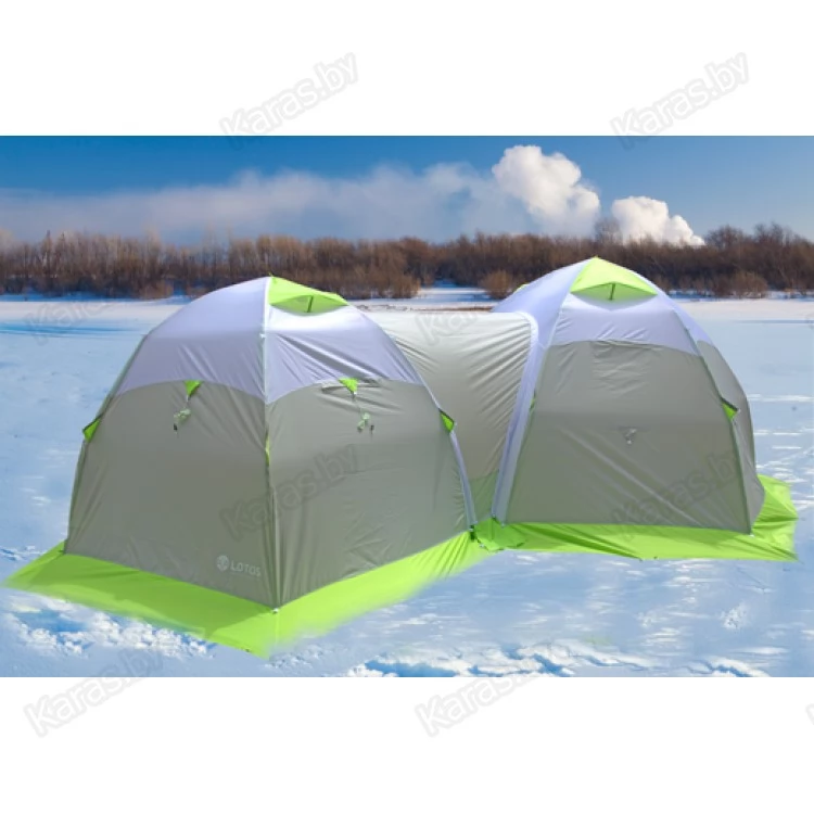 Используя «Соединение» (опция) к D/образному входу палатки «ЛОТОС 5 Универсал» можно присоединить другую модульную палатку (например такую же «ЛОТОС 5 Универсал»). Две, соединенные между собой палатки можно выгодно использовать во время зимней рыбалки. Например, если планируется поездка большой компанией, то можно перемещаться из одной палатки в другую не выходя на улицу, или же использовать одну палатку для инвентаря, а другую для лунок.