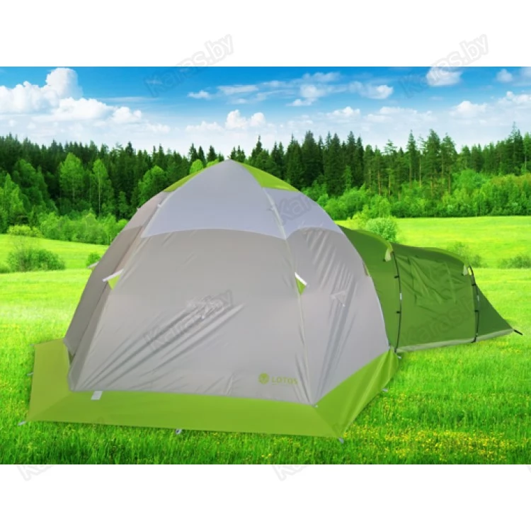 D/образный вход снабжен специальной тракторной молнией и является унифицированным элементом, к которому могут крепиться другие модульные палатки при помощи «Соединения» а также прочие конструкции, например Спальная палатка «ЛОТОС 5 Саммер» .