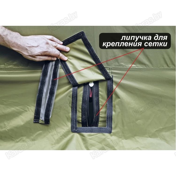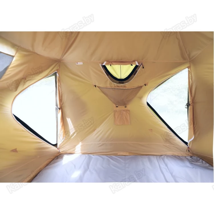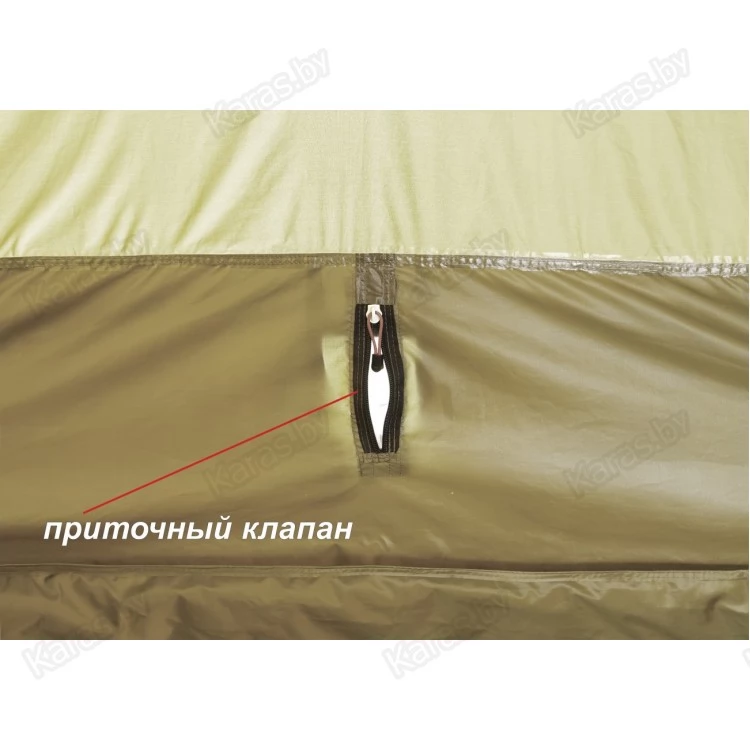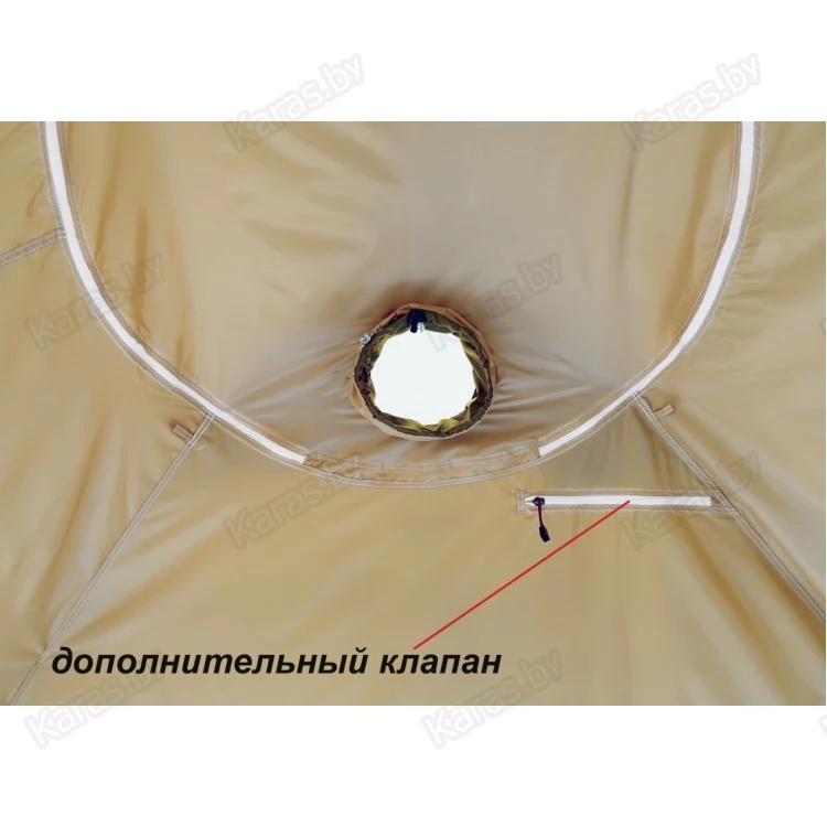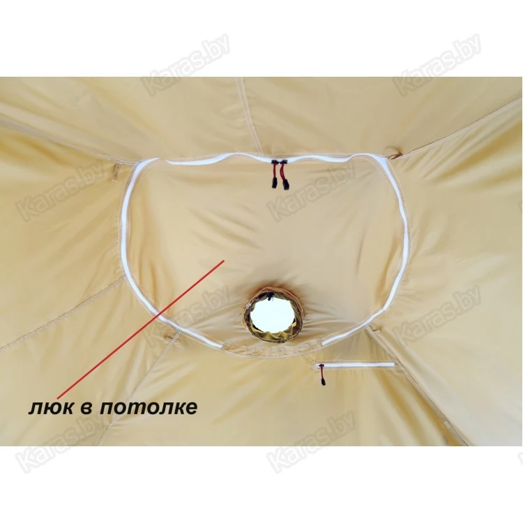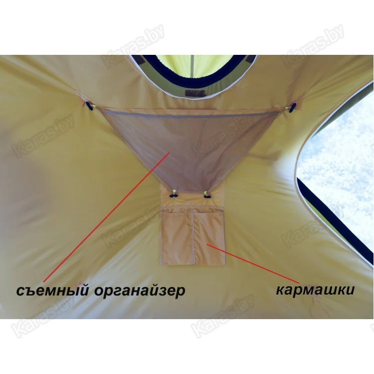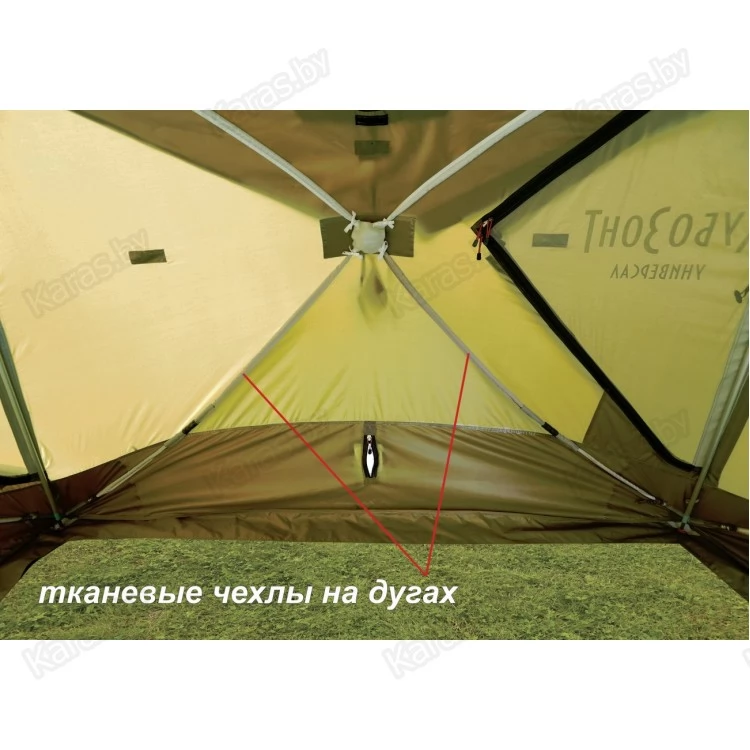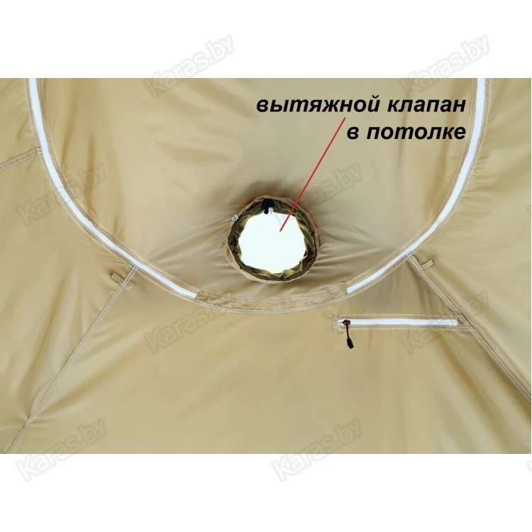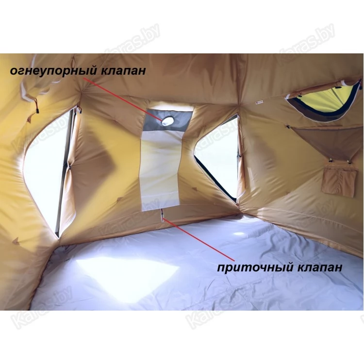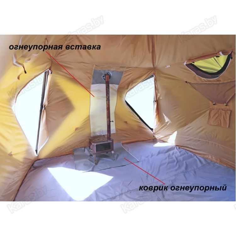 Внутренний тентовый слой в виде герметичной капсулы по форме палатки дублирует все дверные, оконные, вытяжные и приточные проемы внешнего тента, оснащен огнеупорной стенкой для установки отопительной печи и системой крепления гидроизоляционного дна.