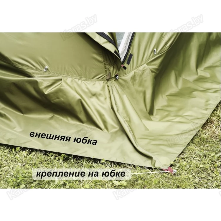 Дно вкладывается внутрь палатки, прижимая своими краями к земле внутреннюю юбку внешнего тента, и крепится своими бортиками к стенкам внутреннего тента при помощи «липучек», установленных на них, для фиксации бортиков дна в вертикальном положении. Внутренняя юбка внутреннего тента застилается внутрь гидроизоляционного дна, а внешняя юбка внутреннего тента располагается с внешней стороны бортиков дна.