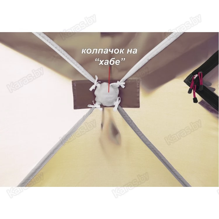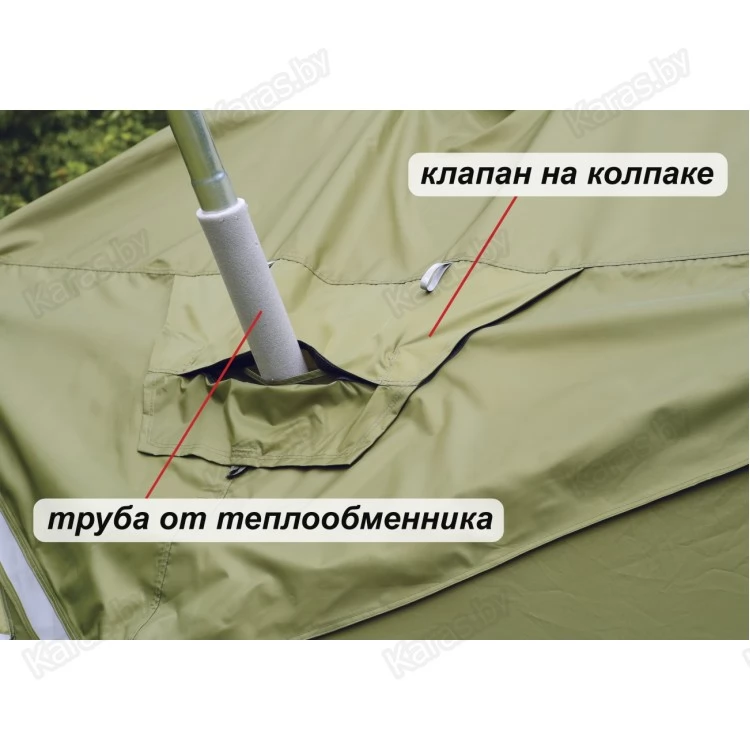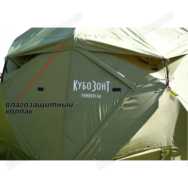 Дополнительный внешний тентовый слой (влагозащитный колпак) выполнен из прочной водостойкой ткани. Швы колпака проклеены герметизирующей лентой. Влагозащитный колпак полностью защищает верхнюю часть палатки от намокания. Дублируя вытяжной клапан в макушке палатки и все четыре окошка, колпак образует защитный козырек для окон, обеспечивает влагозащиту для огнеупорного клапана, а также формирует защитную планку для съемной распашной двери.