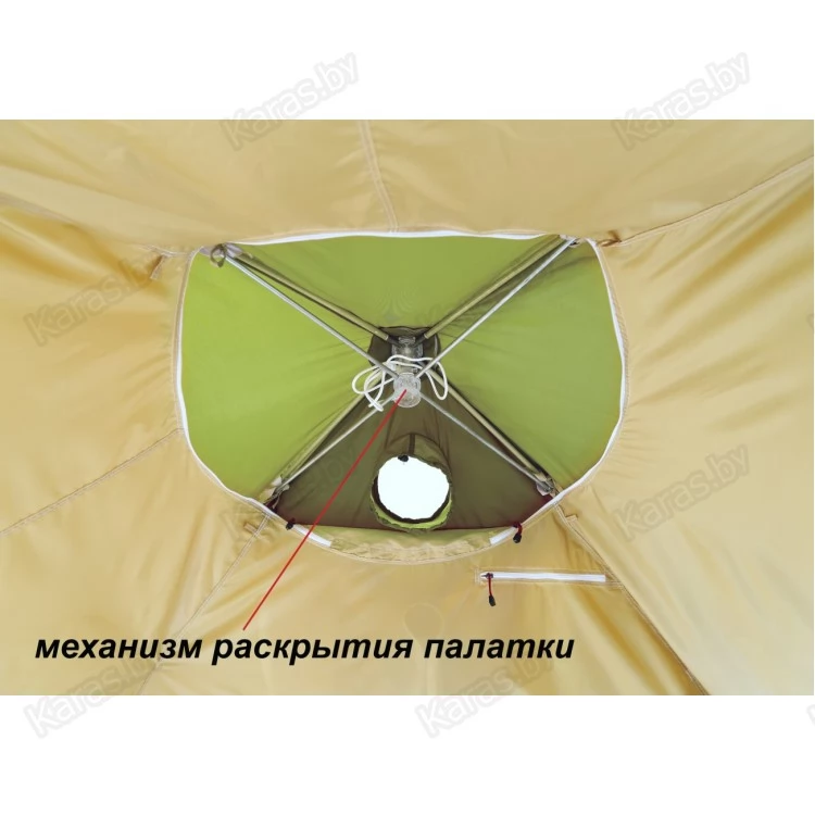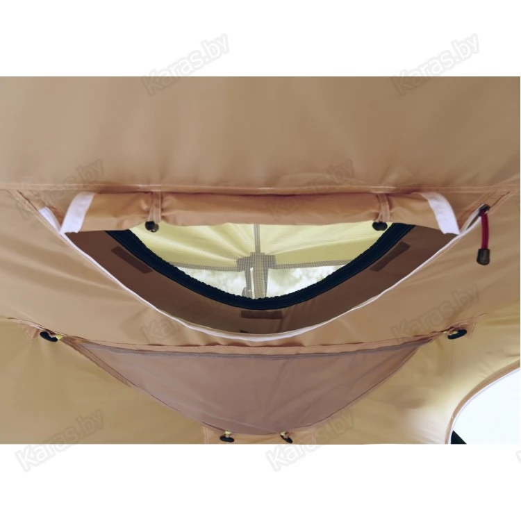 Палатка Лотос КубоЗонт 4-У оснащена двумя основными тентовыми слоями, разделенными между собой воздушной прослойкой (около 5 см) и дополнительным внешним тентовым слоем – колпаком, установленным на крыше.