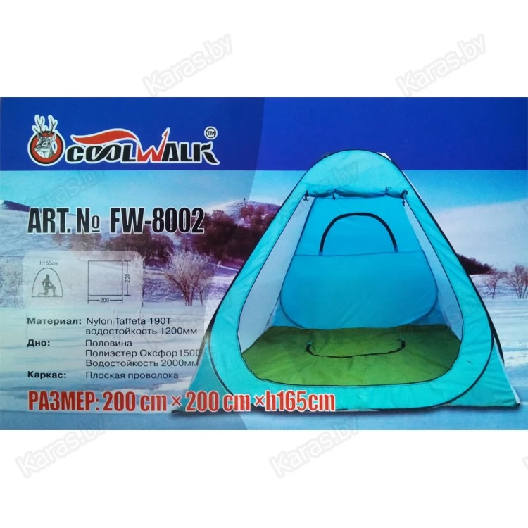 Палатка автомат устанавливается в течение пяти секунд. Тент выполнен из непромокаемой и непромокаемой ткани Nylon Taffeta 190T. В центре пола расположена молния, позволяющая освободить пространство на льду для сверления лунок. На одной из стенок располежено окно на молнии. Снизу на гранях расположены петли для ввертышей. Упаковывается в плотную сумку с ручками для переноски.