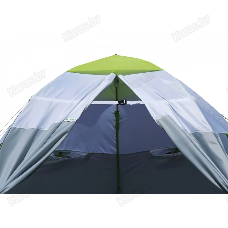 Широкая двухстворчатая Т-образная дверь палатки оснащена тремя замками, позволяющими открывать каждую створку по отдельности, а также раскрывать дверь во всю стенку палатки, образуя проход шириной 1,5 метра. Широкий вход позволяет заносить внутрь крупногабаритные вещи и является несомненным преимуществом палаток зонтичного типа.