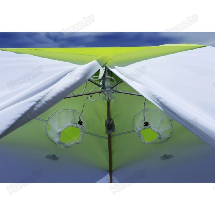 11) В верхней части тента, для системы вентиляции, используются круглые клапаны в виде рукава с утяжкой и фиксатором. Такая конструкция считается самой удобной и надежной на морозе, что доказано на практике. Снаружи клапаны защищены от попадания осадков регулируемыми козырьками.