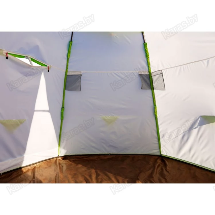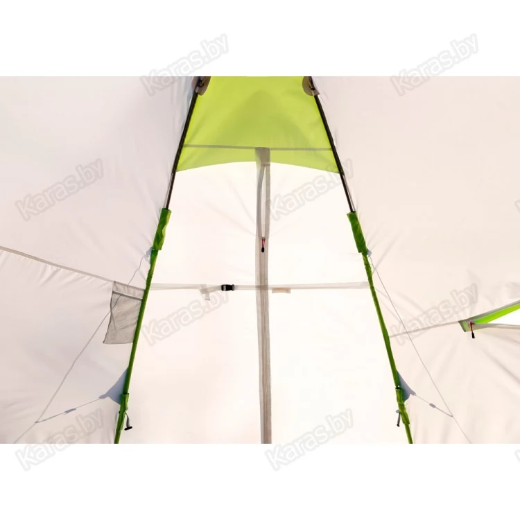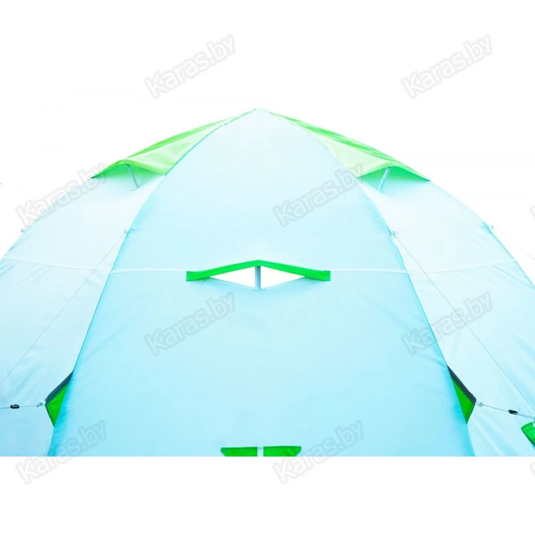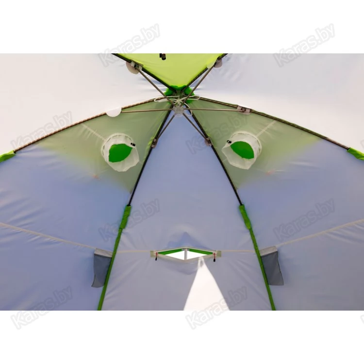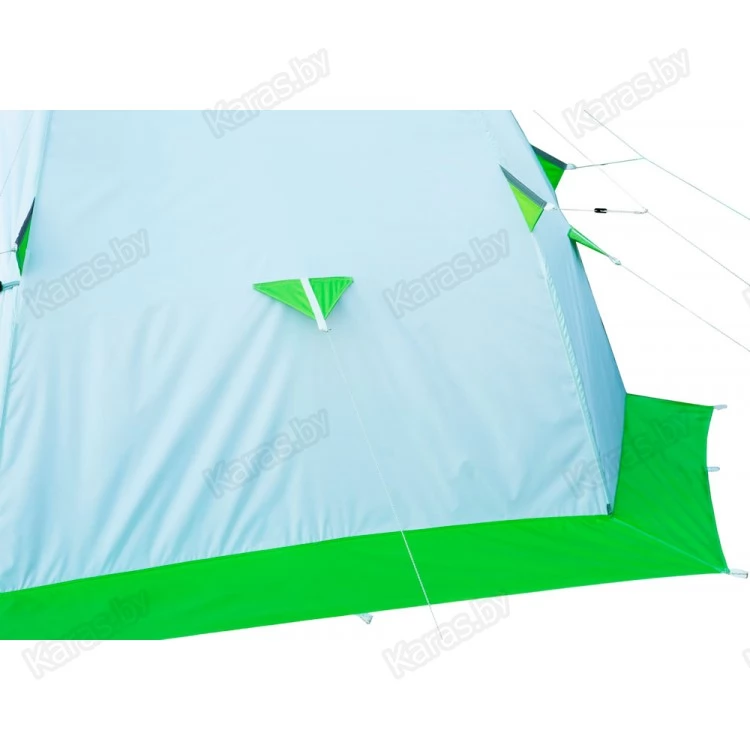 Окраска палатки выполнена в белом цвете с ярко-салатовыми вставками, и даже в самый пасмурный день в ней будет всегда светло и уютно. Для безопасности в ночное время предусмотрены светоотражающие элементы на ребрах палатки.