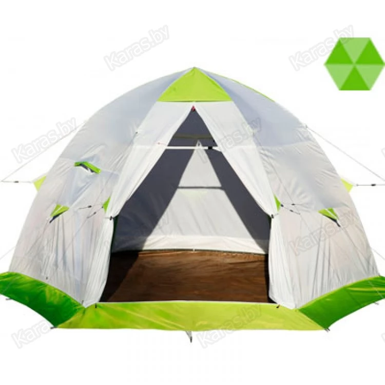 ЛОТОС 5 - шестигранная полуавтоматическая палатка зонтичного типа раскрытия. Тент и каркас образуют единую цельную конструкцию, благодаря чему при раскрытии палатка сразу же принимает окончательную жесткую и устойчивую форму. Палатка оснащена максимально-возможным количеством усиленных креплений для фиксации на льду, что обеспечивает ей способность выдерживать высокие ветровые нагрузки.
