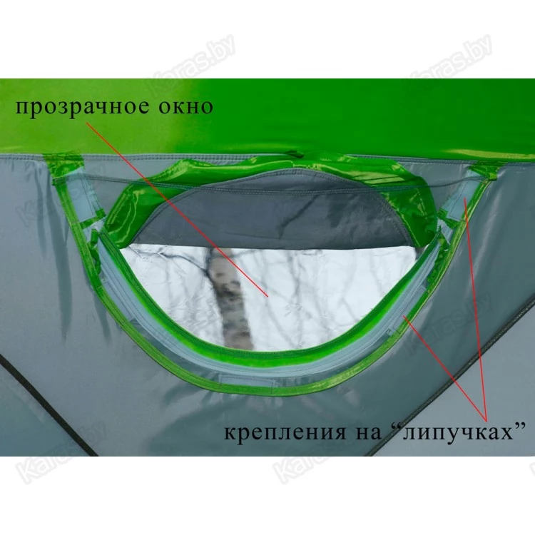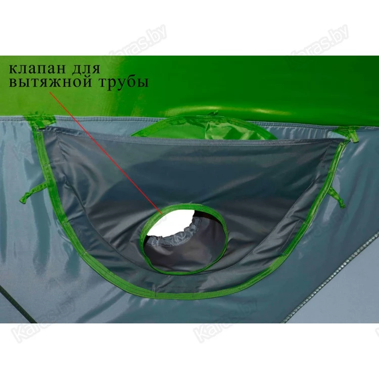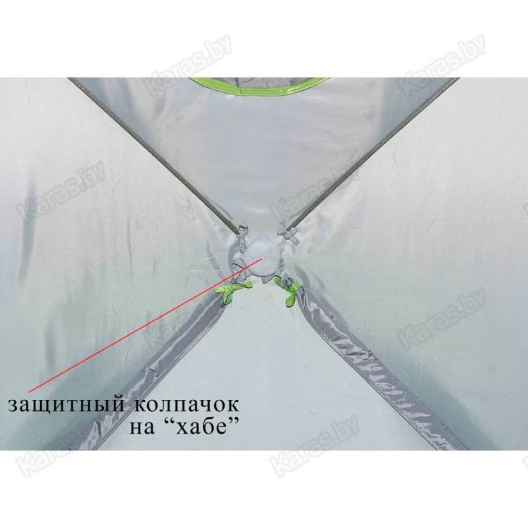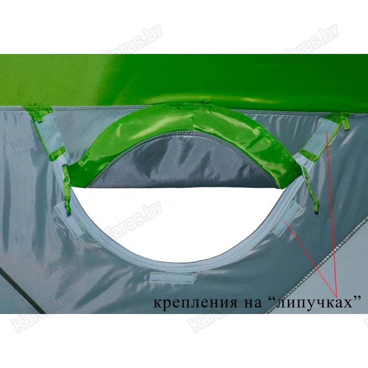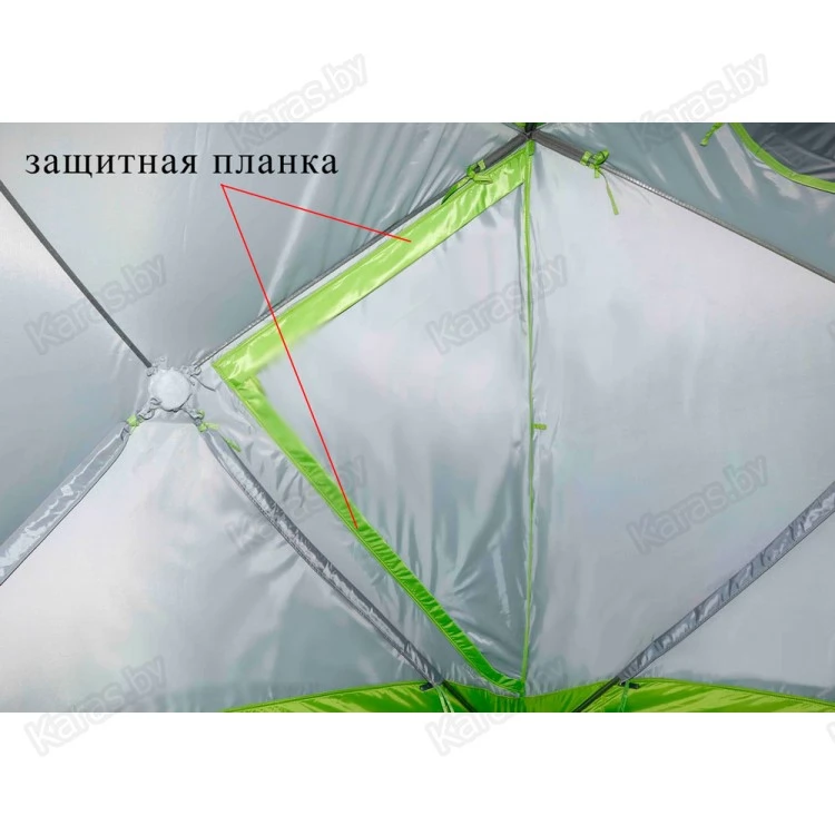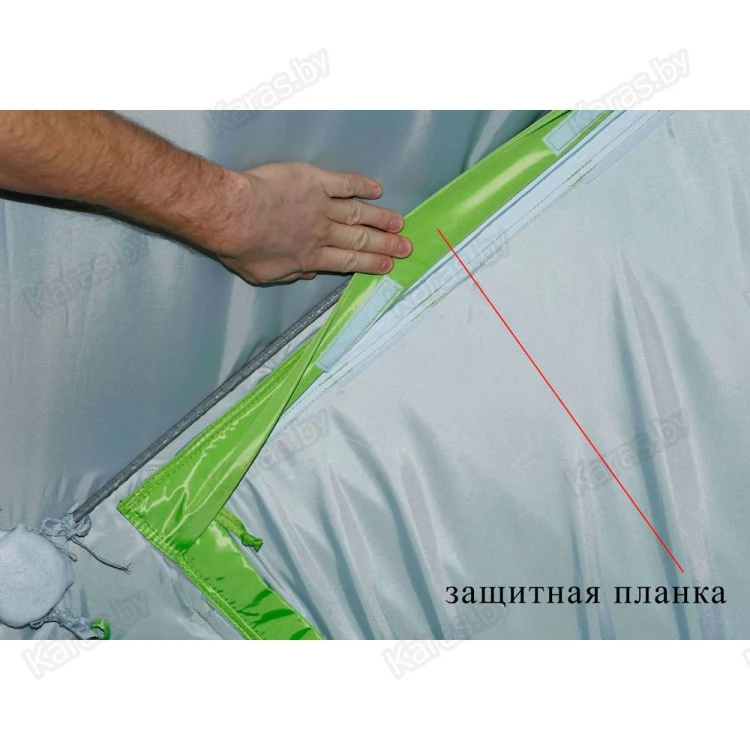 - Система надежной гидроизоляции дна и нижнего периметра стенок палатки! Палатка устанавливается внутрь гидроизоляционного дна (опция), выполненного в форме корыта с защитными бортиками высотой 20 см. Гидроизоляционное дно крепится с внешней стороны тента и надежно защищено от осадков защитной планкой на липучке.