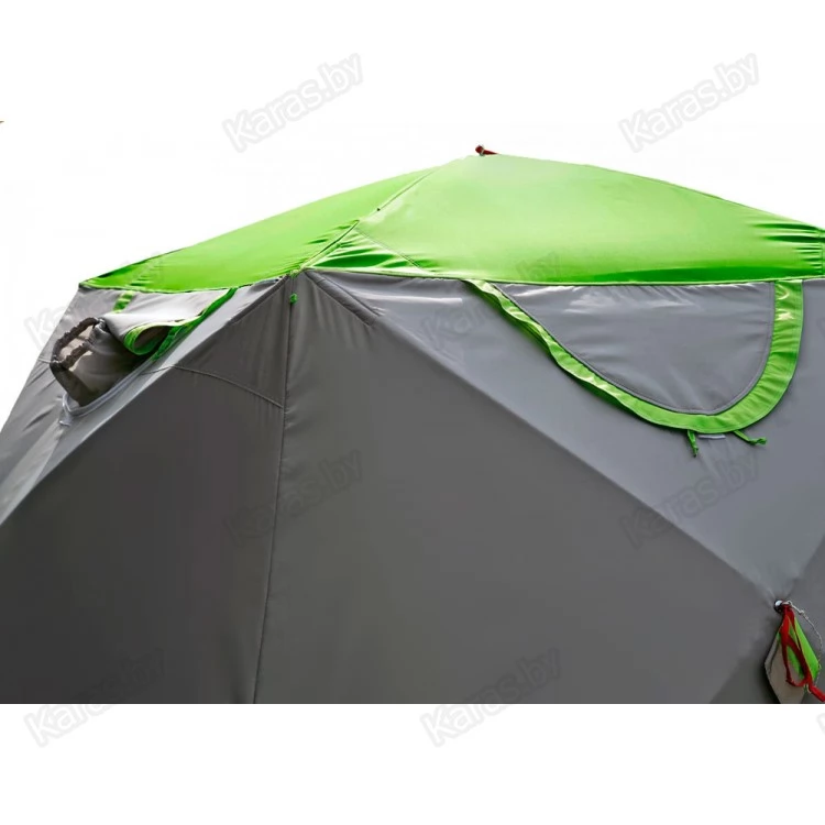 - Надежная защита палаточного укрытия от дождя и солнечных лучей, при сохранении высокой ветроустойчивости конструкции в целом обеспечивается защитным тентом (опция), устанавливаемым над палаткой с образованием воздушного зазора между тентом и куполом палатки.