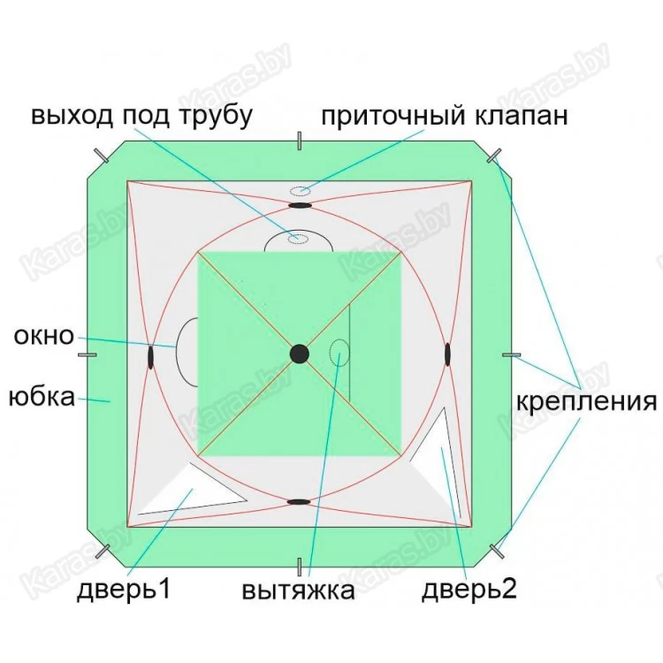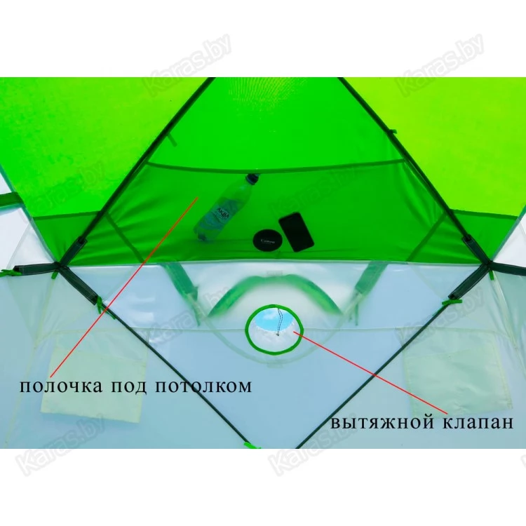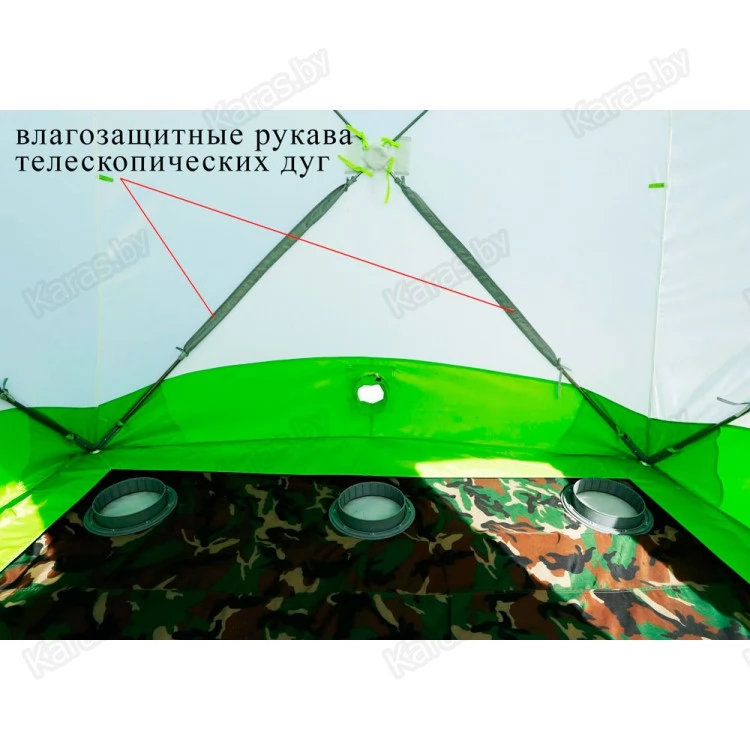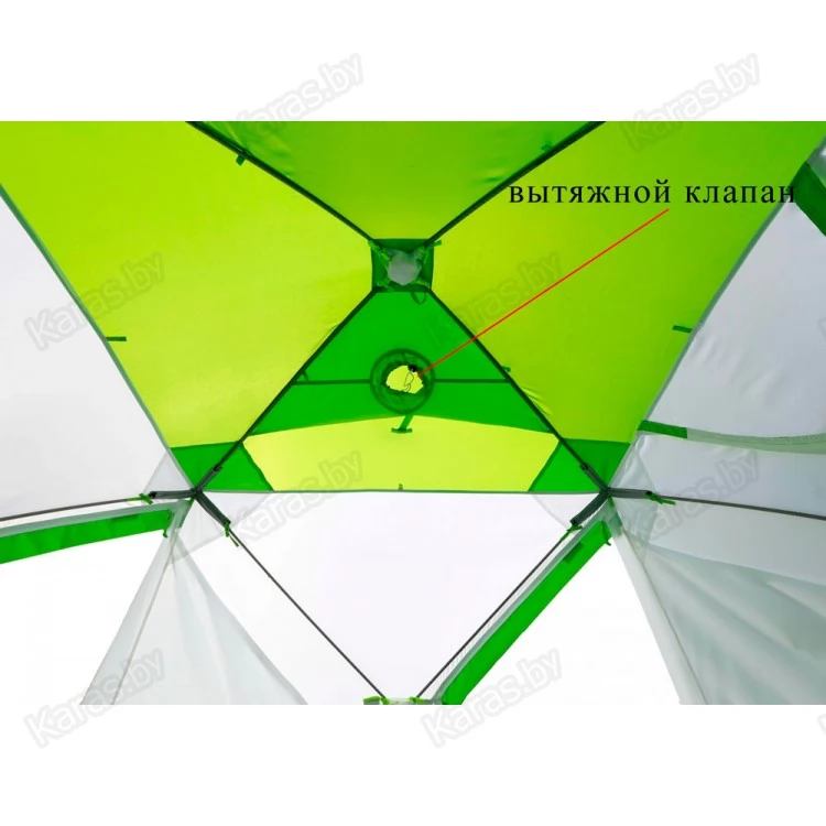 11) В верхней части тента, для системы вентиляции, используются круглые клапаны в виде рукава с утяжкой и фиксатором. Такая конструкция считается самой удобной и надежной на морозе, что доказано на практике. Снаружи клапаны защищены от попадания осадков регулируемыми козырьками.