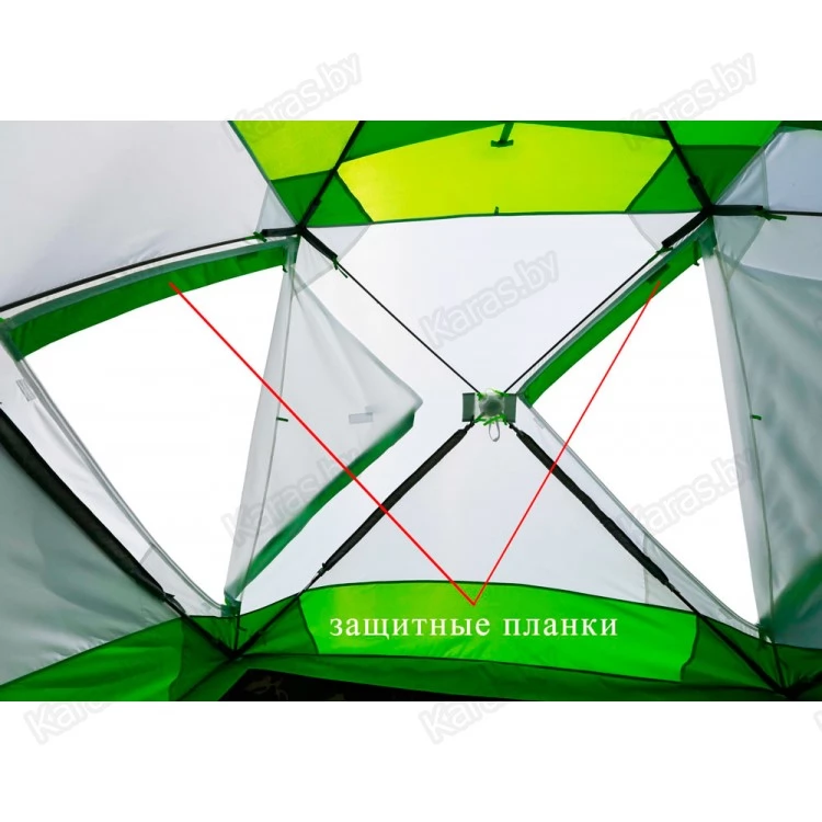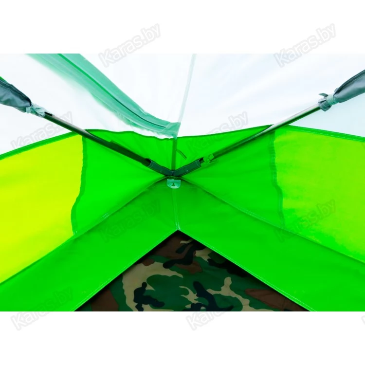 7) Верхняя точка тента, в месте упора каркаса, усилена плотной тканью для защиты от протирания.
