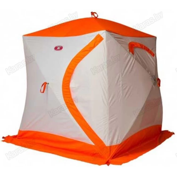 Двухместная палатка, утеплённая термостёжкой. Форма куба позволяет максимально комфортно использовать внутреннее пространство. Модель снабжена ветро-снегозащитной юбкой, двумя окнами для вентиляции, окном на липучке с дополнительной вставкой под трубу и 6 внутренними карманами (по 3 кармана с двух сторон).