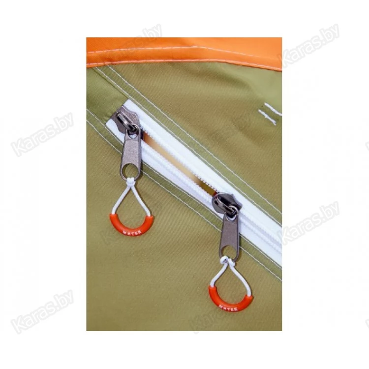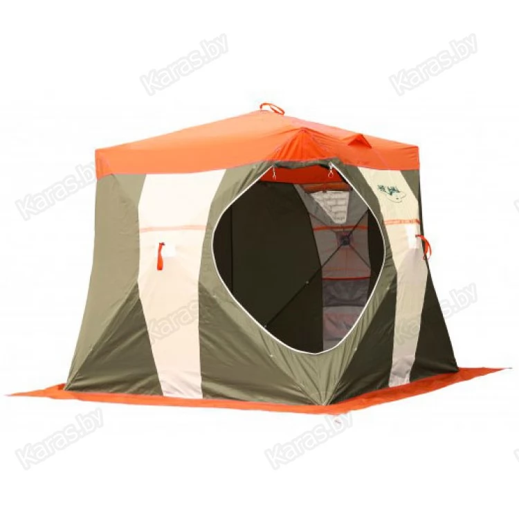 Дизайн палатки - характерный для линейки зимних палаток Митек: ярко-оранжевый купол и чередование светлых и темных цветов внизу.