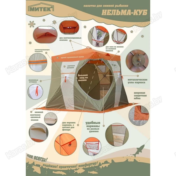 Палатка Нельма КУБ-2 фирмы Митек используется для безопасной и комфортной зимней рыбалки на льду.