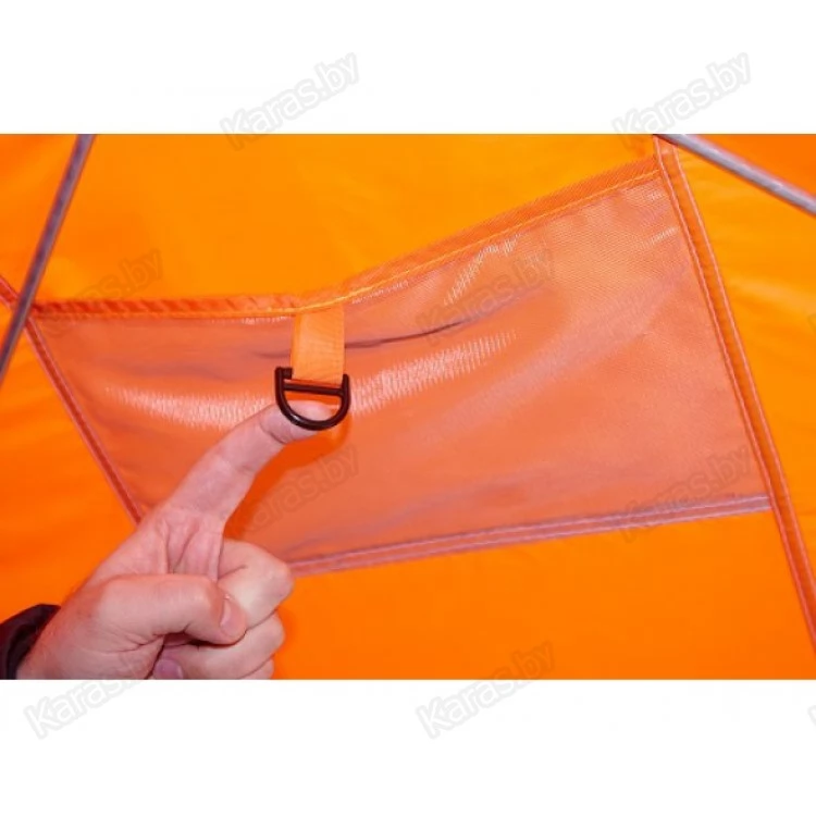 Для вентиляции в палатке предусмотрены клапаны с козырьками, защищающими от попадания снега внутрь. Также в палатке имеются 2 окна со шторками, под которыми находятся прозрачные окошки из специального морозостойкого материала. Окна крепятся на липучках, и их можно полностью отсоединить.