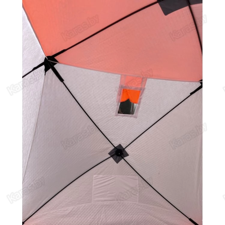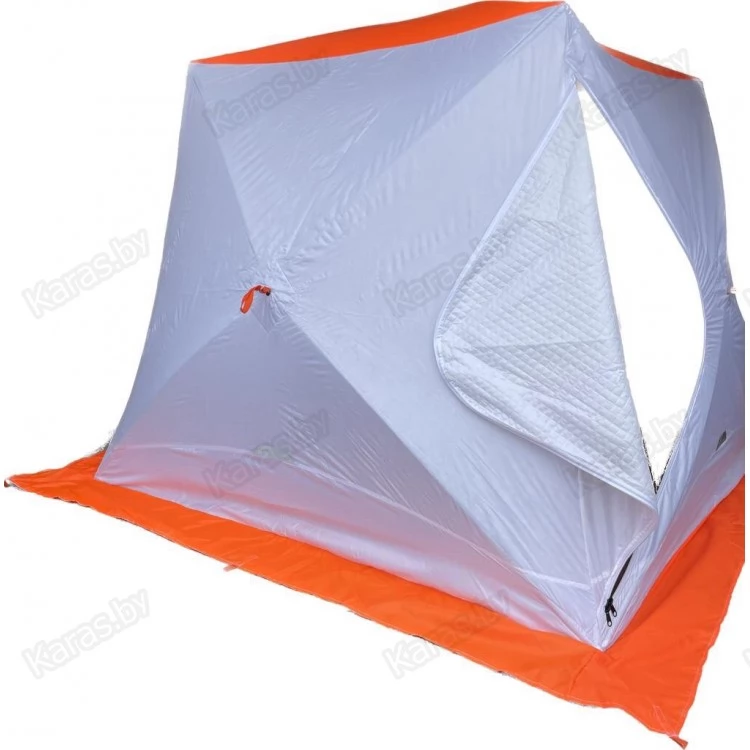 Палатка имеет форму куба, что позволяет рыбакам рационально использовать пространство. Сверлить лунки теперь можно прямо в установленной палатке. Габариты позволяют делать это без каких-либо неудобств. Благодаря своей конструкции палатка выдерживает порывистый ветер. Легко ставится в любую погоду одним человеком. В палатке могут свободно разместиться два человека и комфортно рыбачить как днем, так и ночью! Вход выполнен в угловом варианте и снабжен застежкой - липучкой, как на наружном, так и внутреннем тенте. Так же вход снабжен специальной зимней молнией, которая снаружи имеет защитную планку, предотвращающую от замерзания. Палатка выполнена в светлых тонах и имеет яркую крышу и пороги, а так же светоотражающие элементы по периметру, что позволяет увидеть палатку в ночное время. На наружной юбке имеются оттяжки для крепления порогов при отсутствии снега.