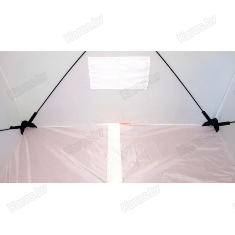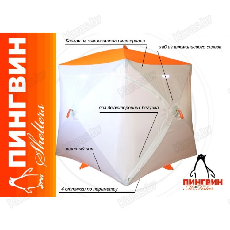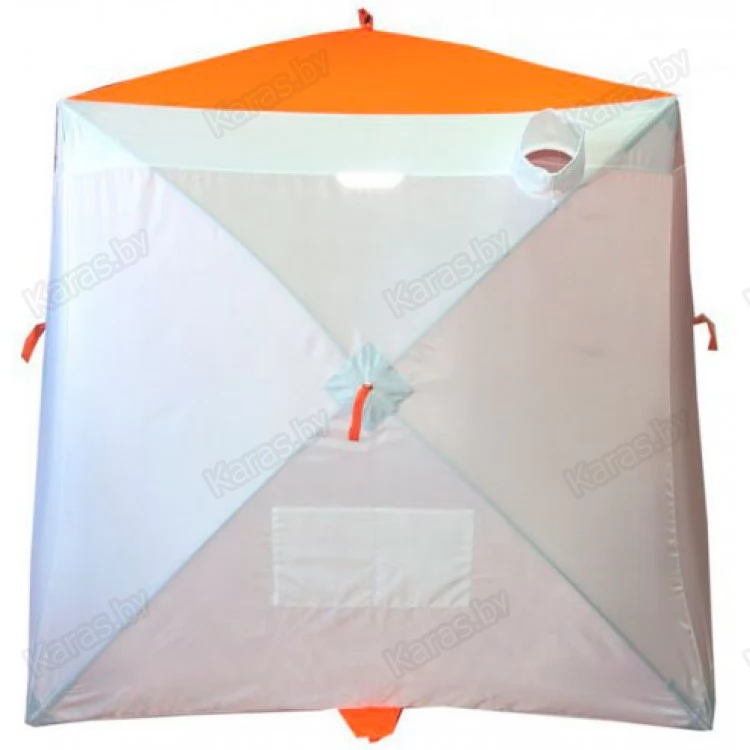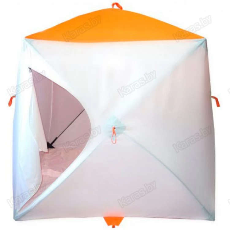 Палатка имеет форму куба, что позволяет рыбакам рационально использовать пространство. Сверлить лунки теперь можно прямо в установленной палатке. Габариты позволяют делать это без каких-либо неудобств. Благодаря своей конструкции палатка выдерживает порывистый ветер. Легко ставится в любую погоду одним человеком. В палатке могут свободно разместиться два человека и комфортно рыбачить как днем, так и ночью! Вход выполнен в угловом варианте и снабжен застежкой - липучкой, как на наружном, так и внутреннем тенте. Так же вход снабжен специальной зимней молнией, которая снаружи имеет защитную планку, предотвращающую от замерзания. Палатка выполнена в светлых тонах и имеет яркую крышу и пороги, а так же светоотражающие элементы по периметру, что позволяет увидеть палатку в ночное время. На наружной юбке имеются оттяжки для крепления порогов при отсутствии снега.