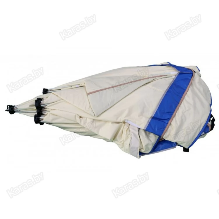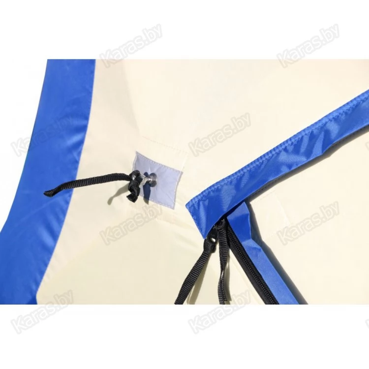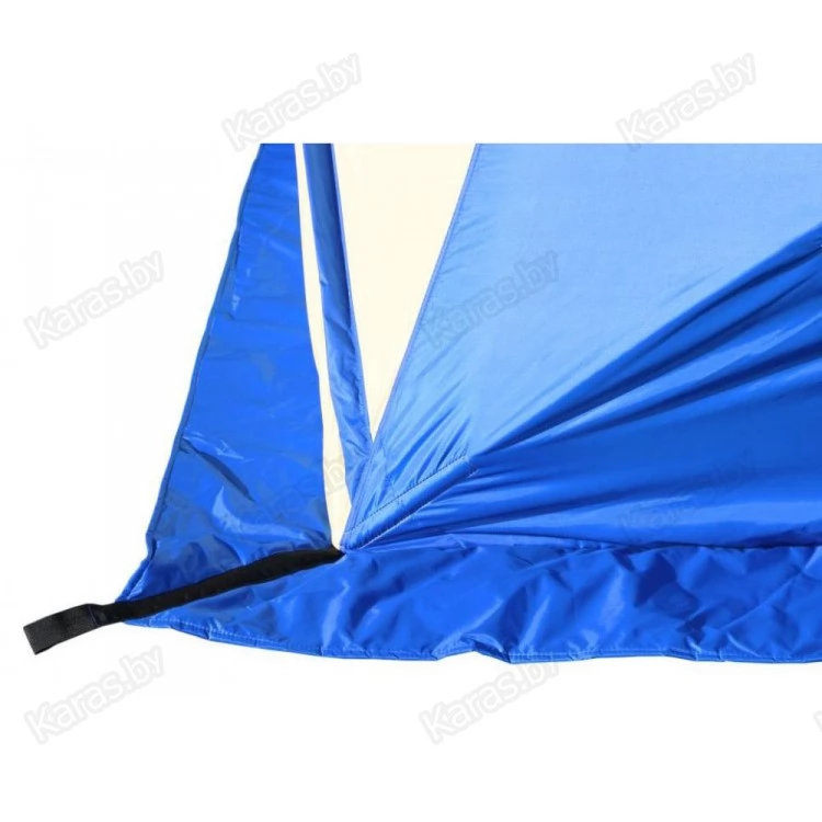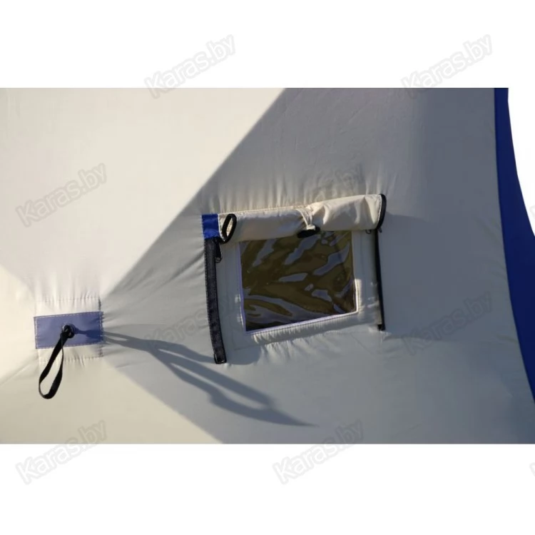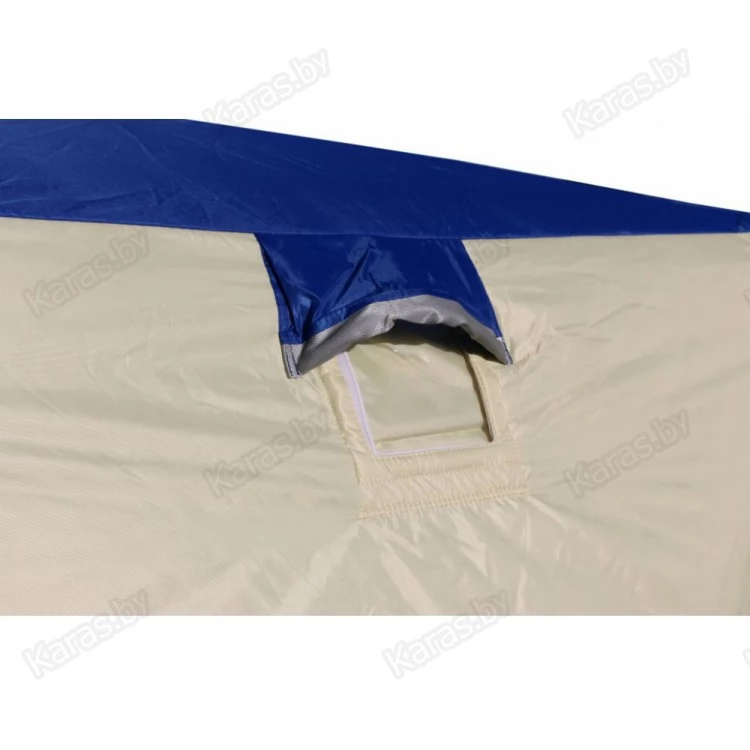 Уникальный трехслойный тент без мостиков холода - тент состоит из трех слоев: внутренний слой из прочной светлой ткани Oxford 240 D 1000 PU склеен со слоем утеплителя из синтепона 180 гр/м2 по всей площади, который в свою очередь также склеен с внешним слоем из ткани Oxford 240 D 1000 PU. Такая конструкция тента (без термостежки) исключает мостики холода и делает тент палаток исключительно теплым.