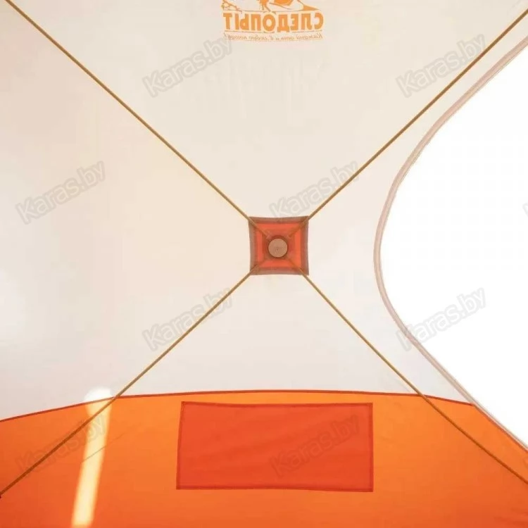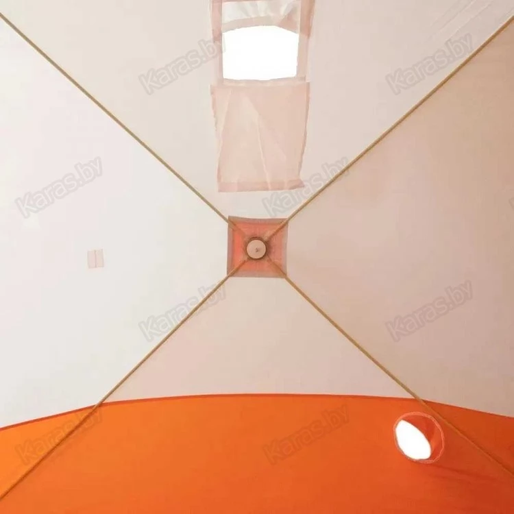 Палатка для зимней рыбалки выполнена из ткани Oxford 210D PU1000 (водостойкость 1000 мм), что обеспечивает долговечность, непродуваемость и водонепроницаемость конструкции. Для хорошего освещения внутреннего пространства в тент встроено два отстегивающихся окна, выполненных из прозрачного морозо- и износостойкого материала. В нижней части к тенту пришита внешняя юбка. Для создания комфортного микроклимата внутри закрытой палатки имеется вытяжной клапан, который также можно использовать как отверстие для трубы печки.