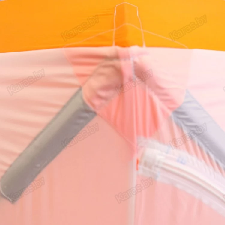 В первую очередь после извлечения палатки Следопыт КУБ из сумки, и его разворота на ледяной поверхности, следует закрепить все четыре конца при помощи специальных ввертышей. Они вставляются в специальные отверстия в палатке.