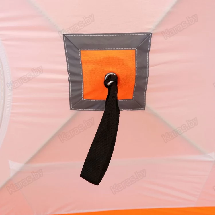 Палатка для зимней рыбалки выполнена из ткани Oxford 240D PU2000 (водостойкость 2000 мм), что обеспечивает долговечность, непродуваемость и водонепроницаемость конструкции. Для хорошего освещения внутреннего пространства в тент встроено два отстегивающихся окна, выполненных из прозрачного морозо- и износостойкого материала. В нижней части к тенту пришита внешняя юбка. Для создания комфортного микроклимата внутри закрытой палатки имеется вытяжной клапан, который также можно использовать как отверстие для трубы печки.