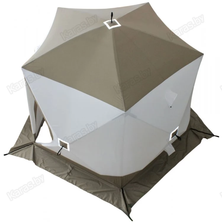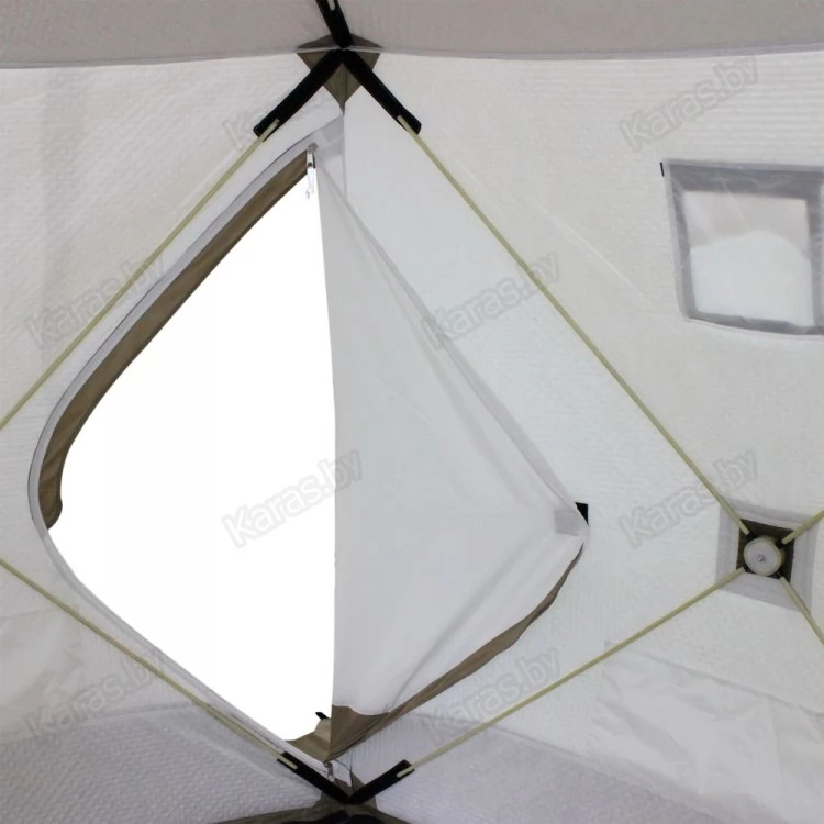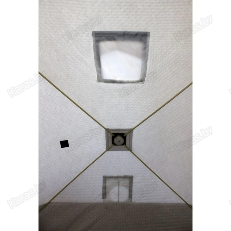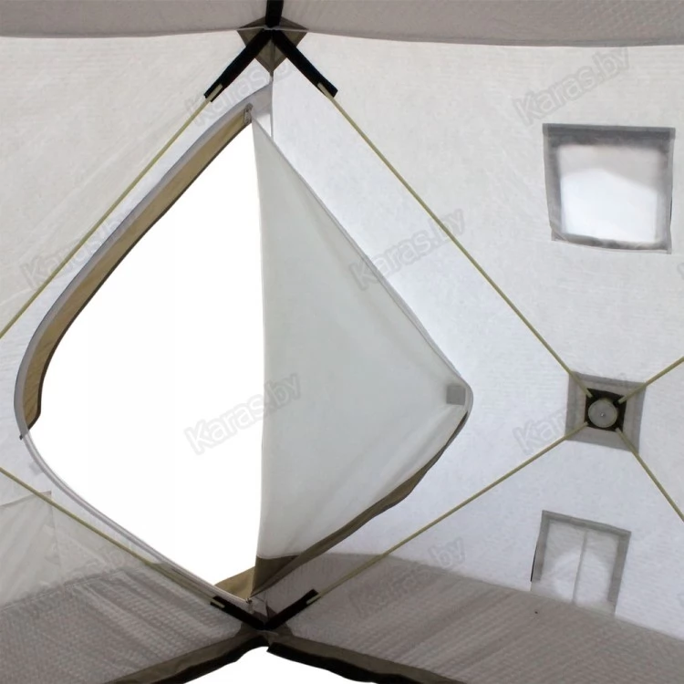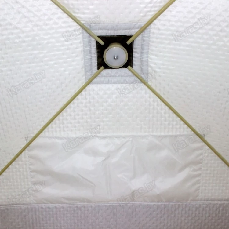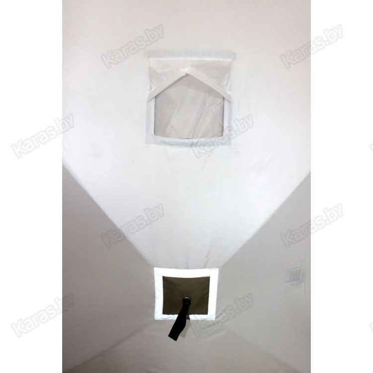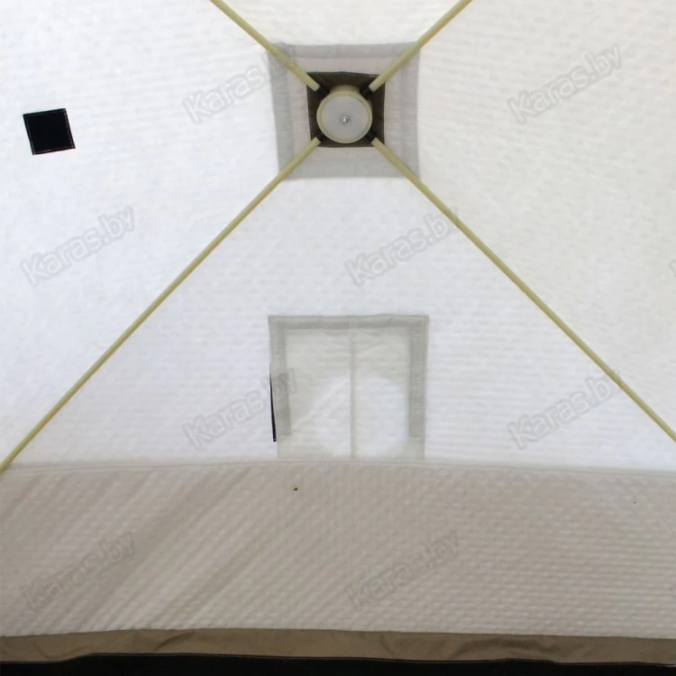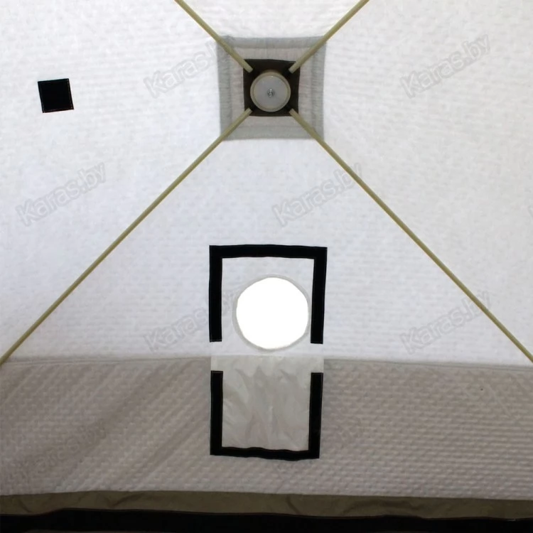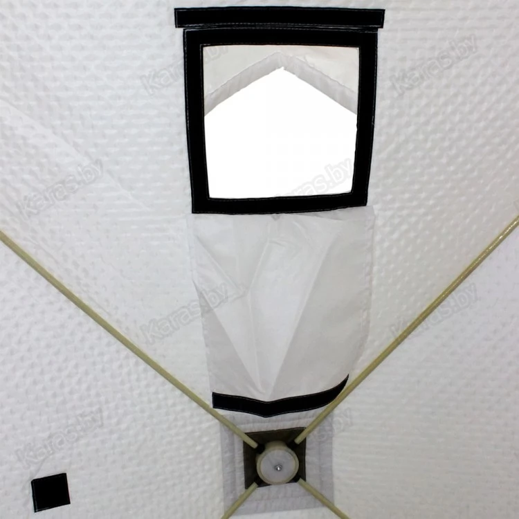 Палатка для зимней рыбалки выполнена из ткани Oxford 240D PU2000 (водостойкость 2000 мм), что обеспечивает долговечность, непродуваемость и водонепроницаемость конструкции. Для хорошего освещения внутреннего пространства в тент встроено три отстегивающихся окна, выполненных из прозрачного морозо- и износостойкого материала. В нижней части к тенту пришита внешняя юбка. Для создания комфортного микроклимата внутри закрытой палатки имеются два вытяжных клапана и один приточный для установки теплообменника.