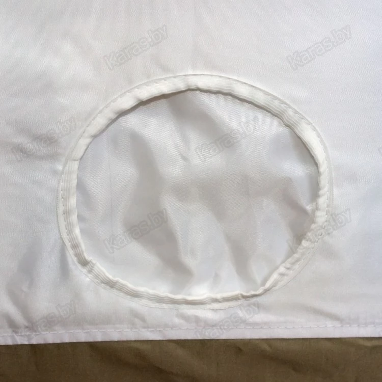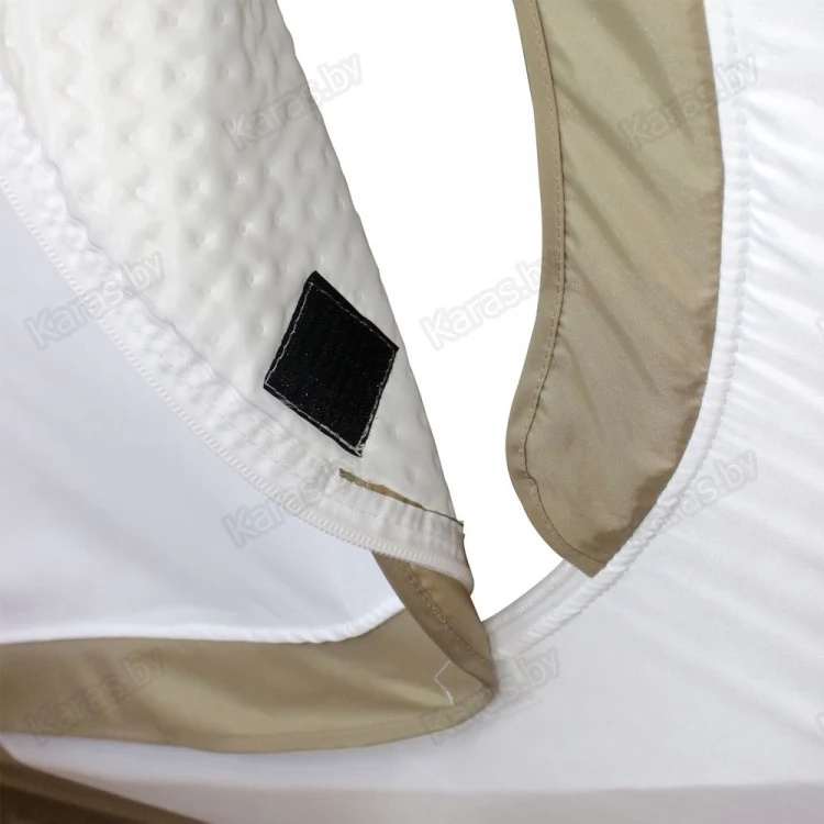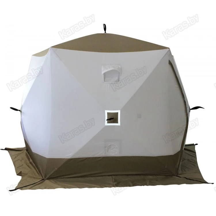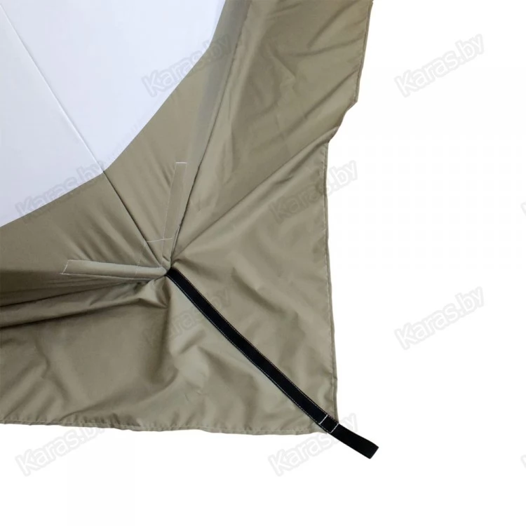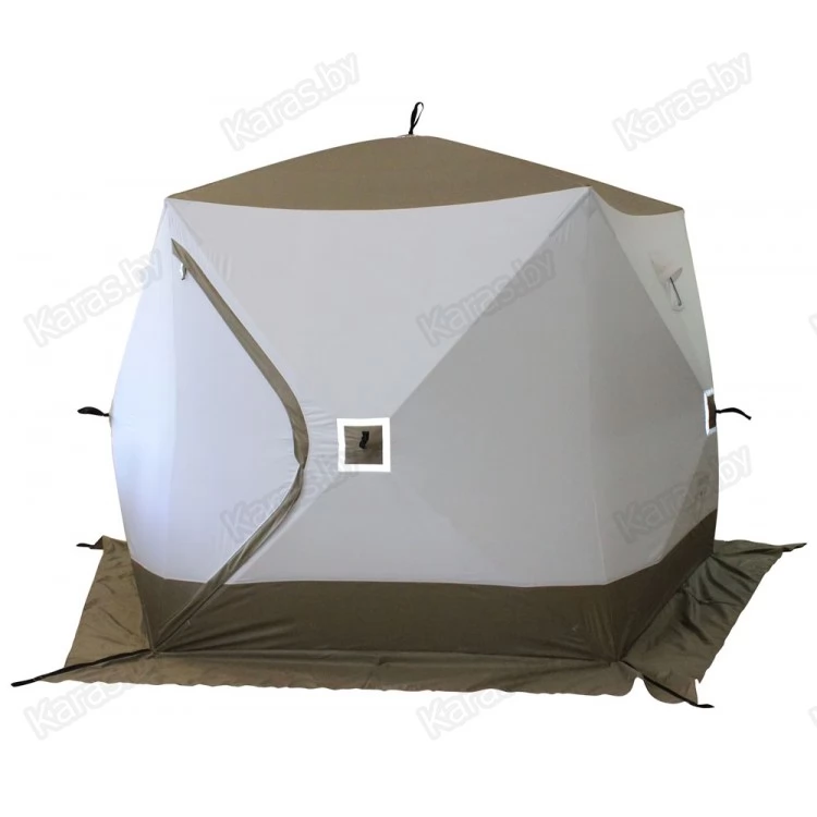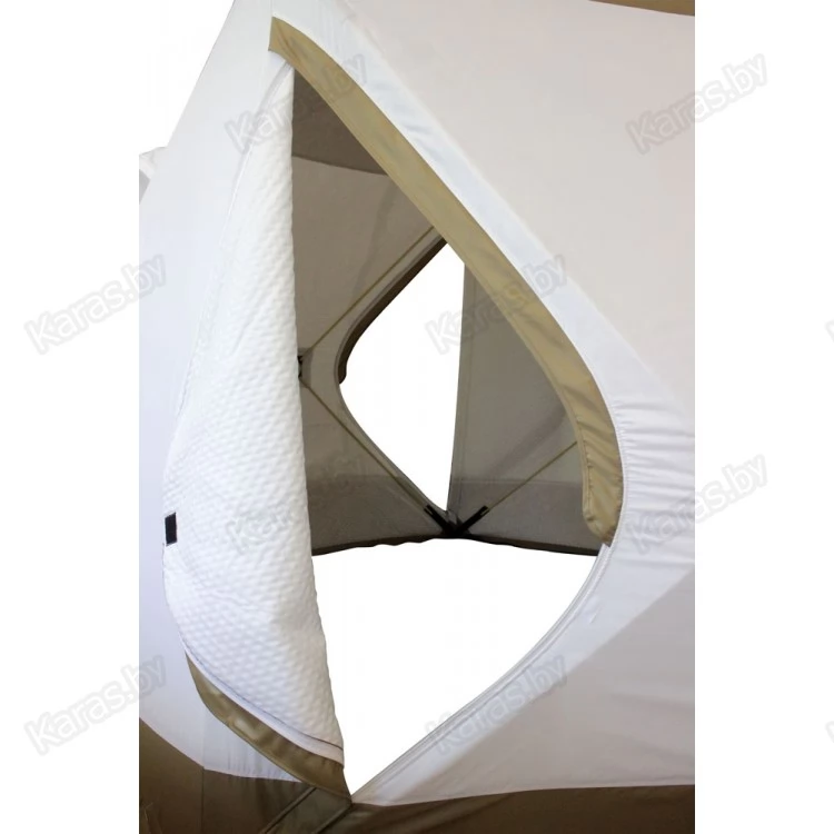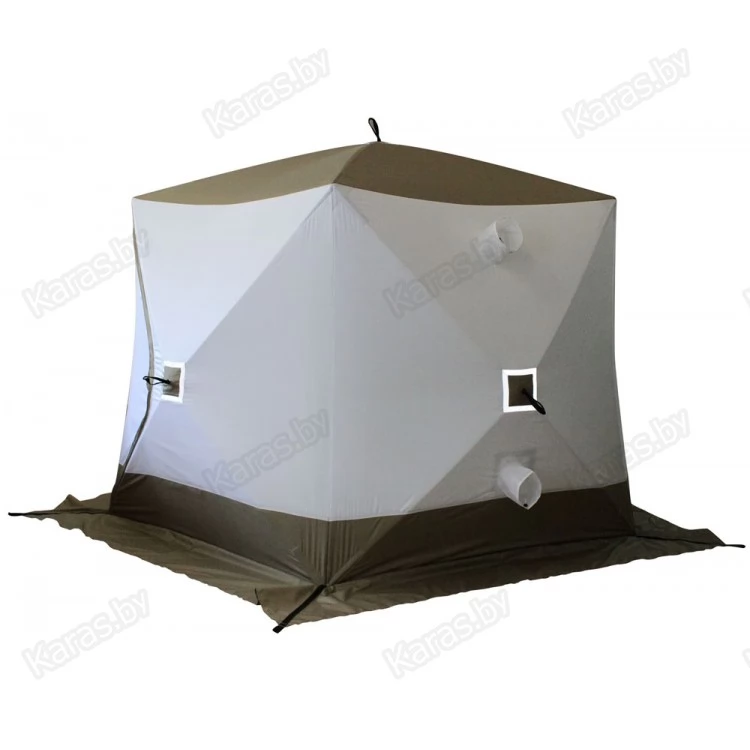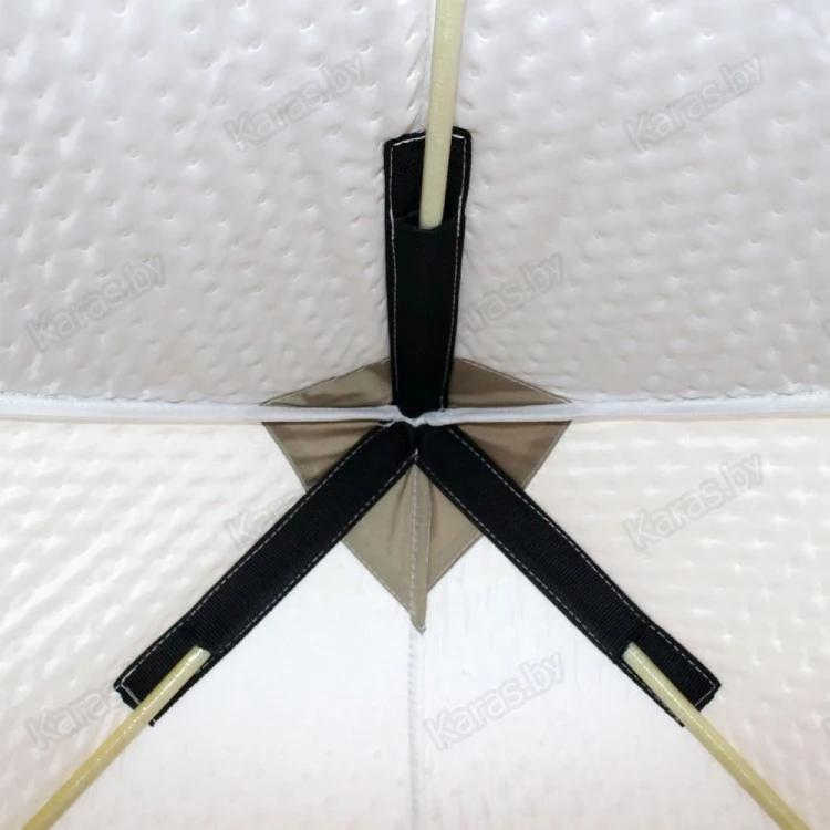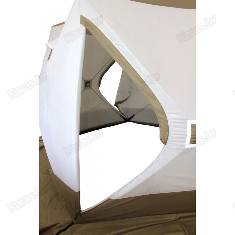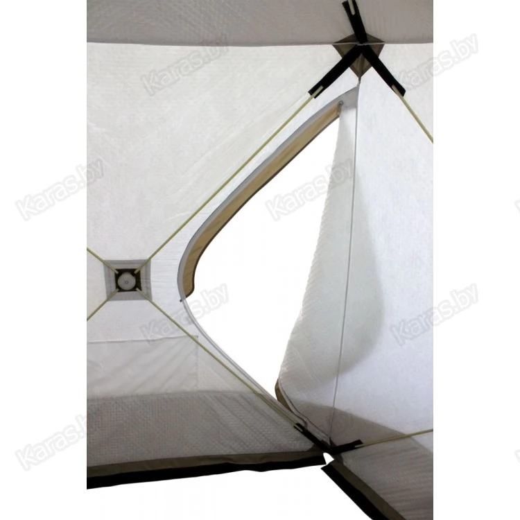 Палатка для зимней рыбалки выполнена из ткани Oxford 240D PU2000 (водостойкость 2000 мм), что обеспечивает долговечность, непродуваемость и водонепроницаемость конструкции. Для хорошего освещения внутреннего пространства в тент встроено три отстегивающихся окна, выполненных из прозрачного морозо- и износостойкого материала. В нижней части к тенту пришита внешняя юбка. Для создания комфортного микроклимата внутри закрытой палатки имеются два вытяжных клапана и один приточный для установки теплообменника.