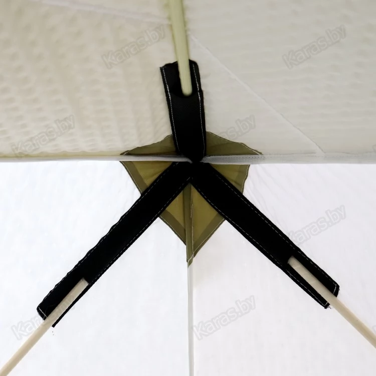 - Устойчивость на ветре и прочность конструкции. Особенность каркаса позволяет без растяжек и ввертышей удерживать палатку на сильном ветре. Сам каркас состоит из хабов (полиамид ударопрочный морозостойкий) и стеклопластиковых прутков 10 мм в диаметре. Для прочности конструкции в углах и местах соединения прутков и хабов, сделано усиление ткани. Конструкция прочная и очень надежная.