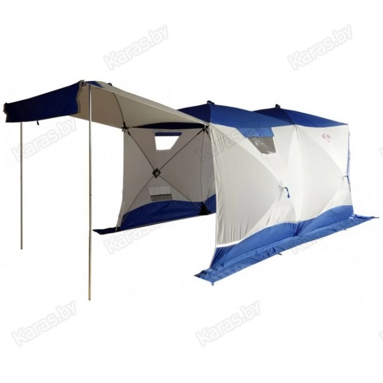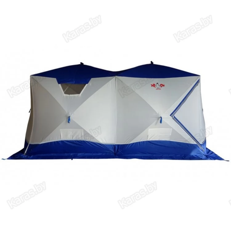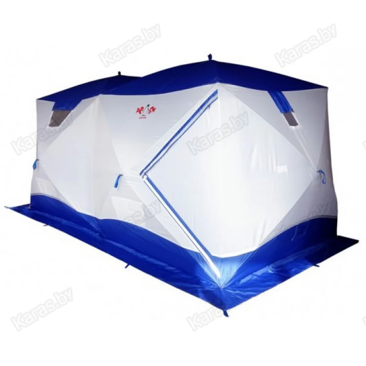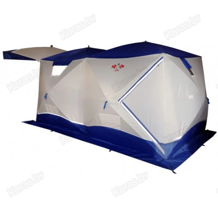 Всесезонная палатка Призма "BIG TWIN" имеет форму двойного куба, что позволяет организовать базовый лагерь от 4-х человек и при этом рационально использовать пространство. "Big Twin" - это не только укрытие для рыбаков. Благодаря конструкции "Шелтерс", одна из сторон поднимается и становится крышей, тем самым модифицируя палатку в шатер. Летом, установив палатку на берегу водоема, вы находитесь в укрытии и в то же время имеете открытый доступ к воде и абсолютно свободно работаете со снастями. В то же время вещи, прикормка, насадка, снасти - всё находится рядом в укрытии. Размеры "Big Twin" позволяют комфортно расположить вещи и с удобством разместиться самим. Зимой сверлить лунки можно непосредственно в установленной палатке. Несмотря на свои размеры, палатка выдерживает порывистый ветер. Легко ставится в любую погоду. Для удобства в палатке также сделано два входа. Входы сделаны напротив друг друга, что позволяет оптимизировать внутреннее пространство (при этом открывающая сторона находится напротив дверей). Входы с фиксатором – липучкой выполнены в угловом варианте и снабжены специальной зимней молнией, которая снаружи имеет защитную планку, предотвращающую от замерзания. На наружной юбке имеются оттяжки для крепления порогов при отсутствии снега. Тент кроме поднимающейся стороны и двух входов имеет: 3 форточки, выполненных из прозрачной морозостойкой ПВХ-плёнки (одна полностью съёмная), 4 настрочных кармана с сеткой, 4 потолочных кармана-сетки, выход под трубу на липе. Основной цвет белый с цветной крышей и порогами. Снаружи имеются светоотражающие элементы, что очень важно для безопасности на льду в темное время суток.