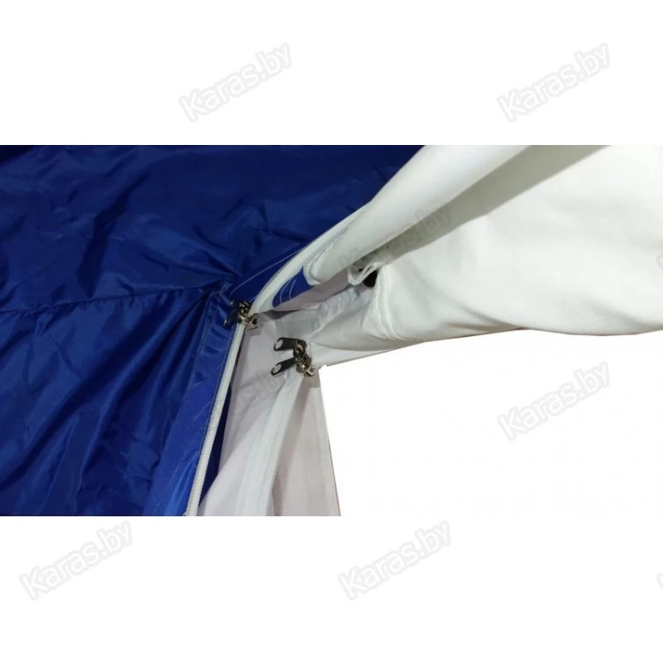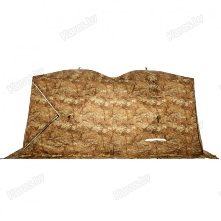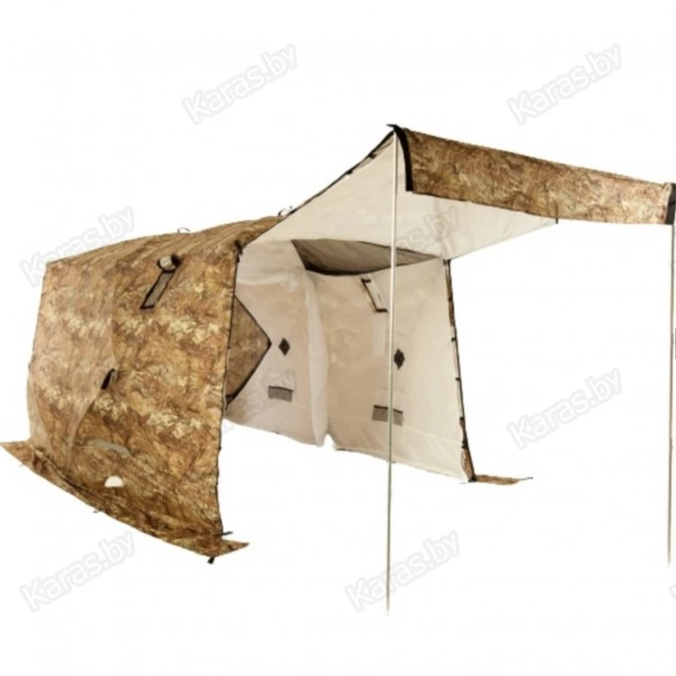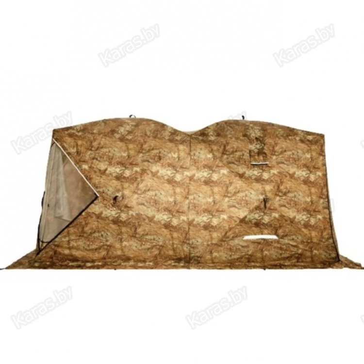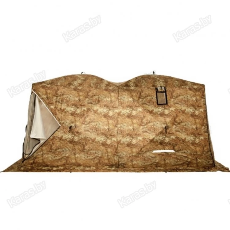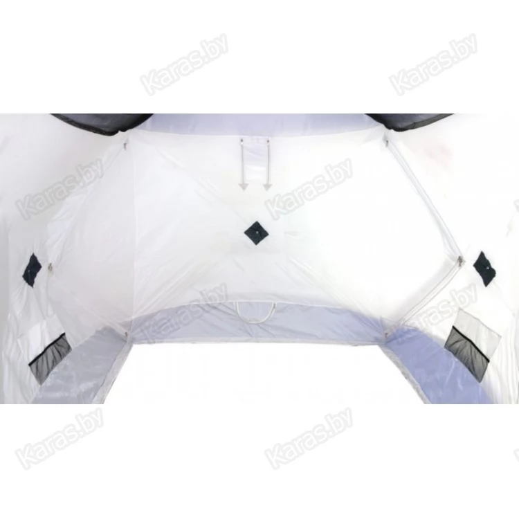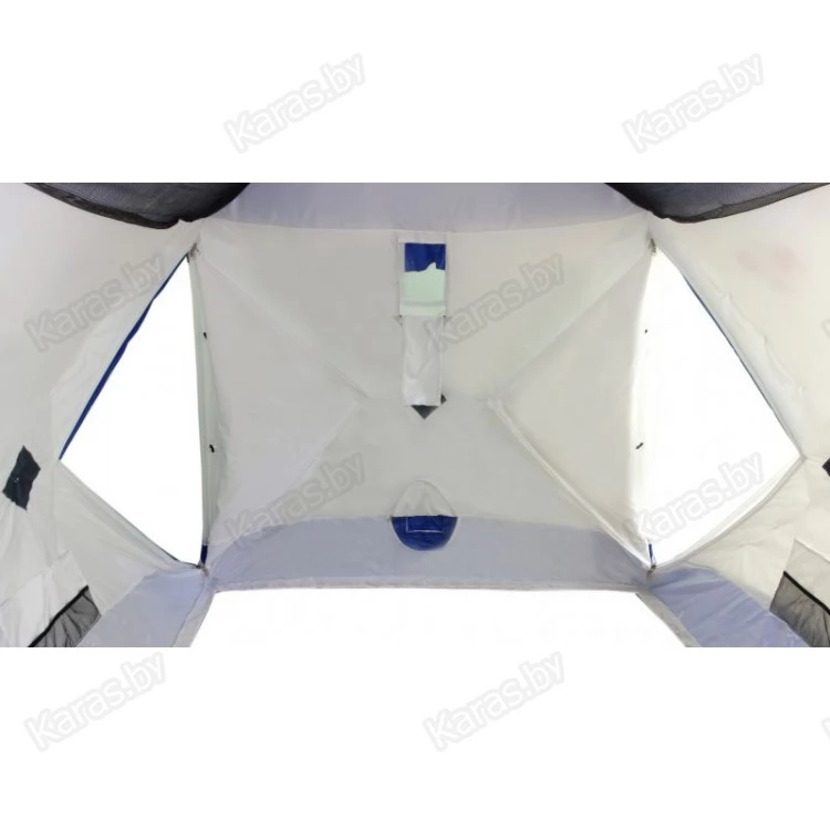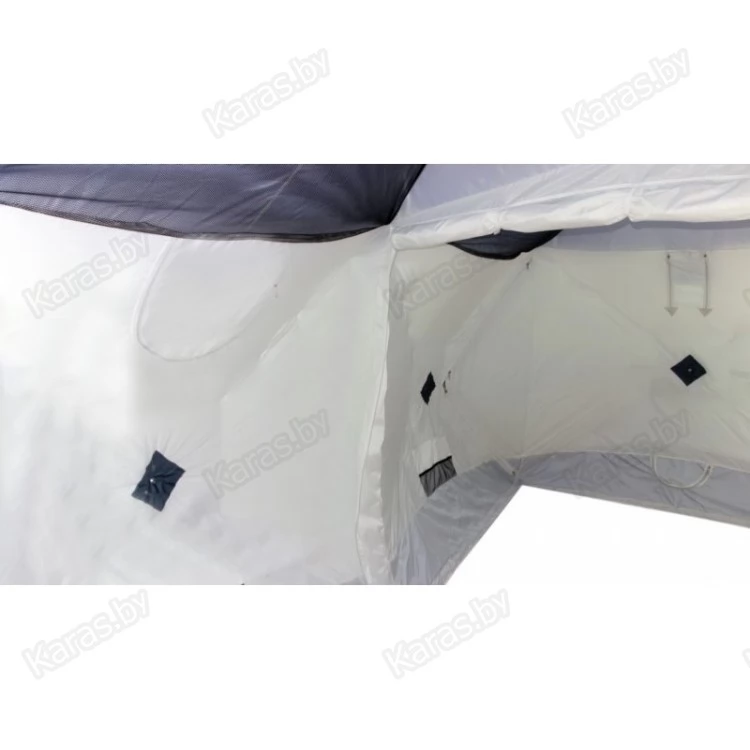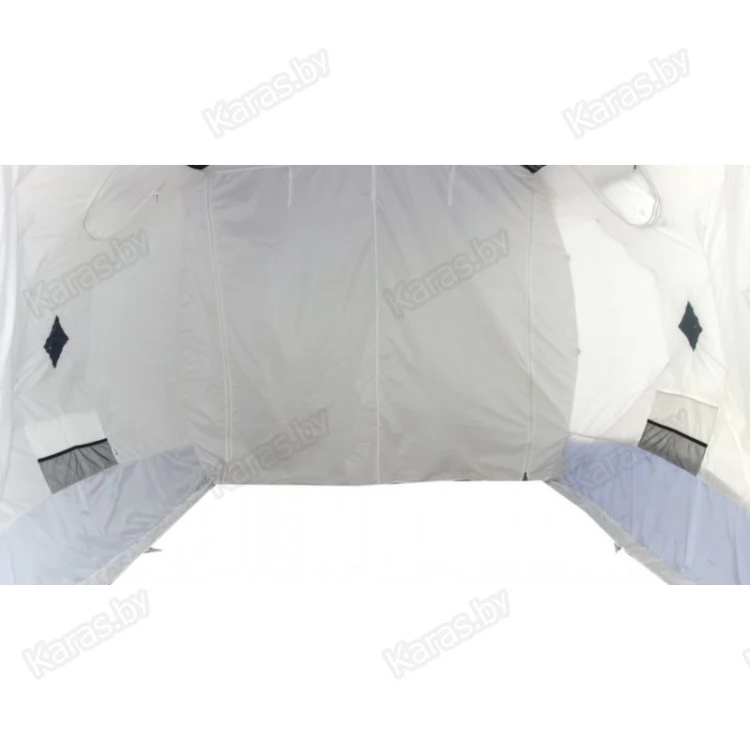 Всесезонная палатка Призма Шелтерс "BIG TWIN" (2-сл.) - новинка сезона! Имеет форму двойного куба, что позволяет организовать базовый лагерь от 4-х человек и при этом рационально использовать пространство. "Big Twin" - это не только укрытие для рыбаков. Благодаря конструкции "Шелтерс", одна из сторон поднимается и становится крышей, тем самым модифицируя палатку в шатер. Летом, установив палатку на берегу водоема, вы находитесь в укрытии и в то же время имеете открытый доступ к воде и абсолютно свободно работаете со снастями. В то же время вещи, прикормка, насадка, снасти - всё находится рядом в укрытии. Размеры "Big Twin" позволяют комфортно расположить вещи и с удобством разместиться самим. Зимой сверлить лунки можно непосредственно в установленной палатке. Несмотря на свои размеры, палатка выдерживает порывистый ветер. Легко ставится в любую погоду. Для удобства в палатке также сделано два входа. Входы сделаны напротив друг друга, что позволяет оптимизировать внутреннее пространство (при этом открывающая сторона находится напротив дверей). Входы с фиксатором – липучкой выполнены в угловом варианте и снабжены специальной зимней молнией, которая снаружи имеет защитную планку, предотвращающую от замерзания. На наружной юбке имеются оттяжки для крепления порогов при отсутствии снега. Тент кроме поднимающейся стороны и двух входов имеет: 3 форточки, выполненных из прозрачной морозостойкой ПВХ-плёнки (одна полностью съёмная), 4 настрочных кармана с сеткой, 4 потолочных кармана-сетки, выход под трубу на липе. Основной цвет белый с цветной крышей и порогами. Снаружи имеются светоотражающие элементы, что очень важно для безопасности на льду в темное время суток.