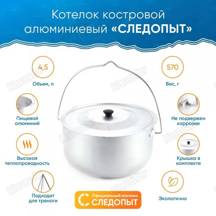 Котелок для похода цилиндрический «Следопыт» - ваш отличный спутник как на даче, так и в любой загородной поездке. Кастрюля изготовлена из пищевого алюминия, практична, не подвержена коррозии и проста в уходе. Туристический котелок обладает высокой теплопроводностью, что позволяет ему быстро прогреваться. Его небольшая масса облегчает транспортировку. Казанок с крышкой, что предотвращает выкипание жидкости. Качественная ручка с изгибом под треногу или костровой трос не позволит котелку соскользнуть. Котелок Следопыт это отличная походная посуда для приготовления ухи, каши, жаркого и других вкусных блюд!