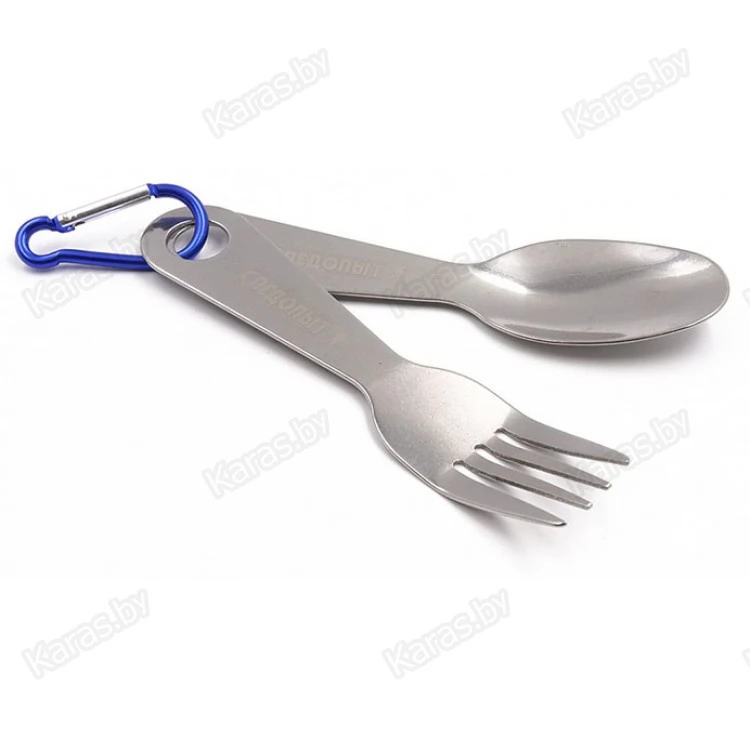 Набор столовых приборов состоит из вилки, ложки и карабина.