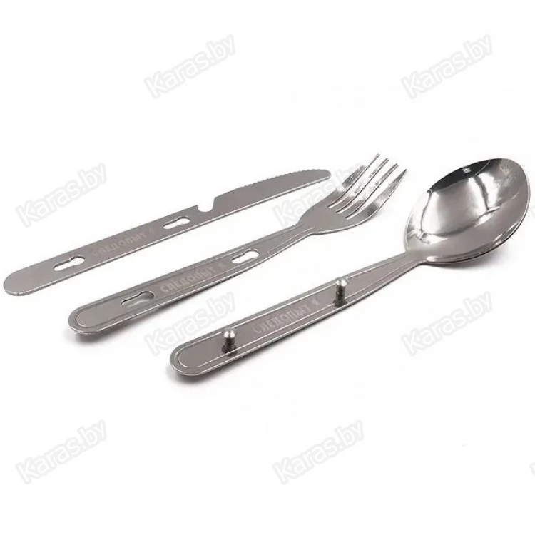 Набор столовых приборов состоит из вилки, ложки и ножа.