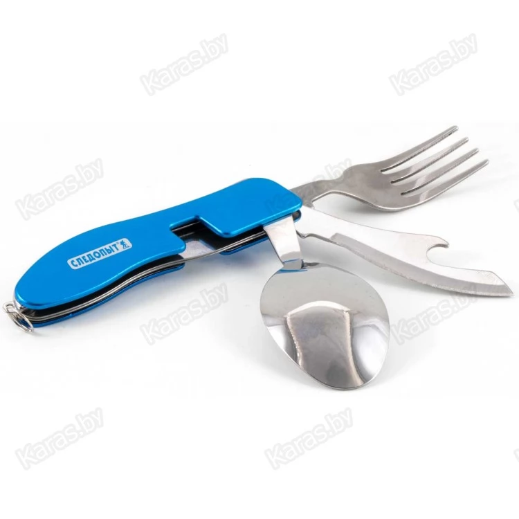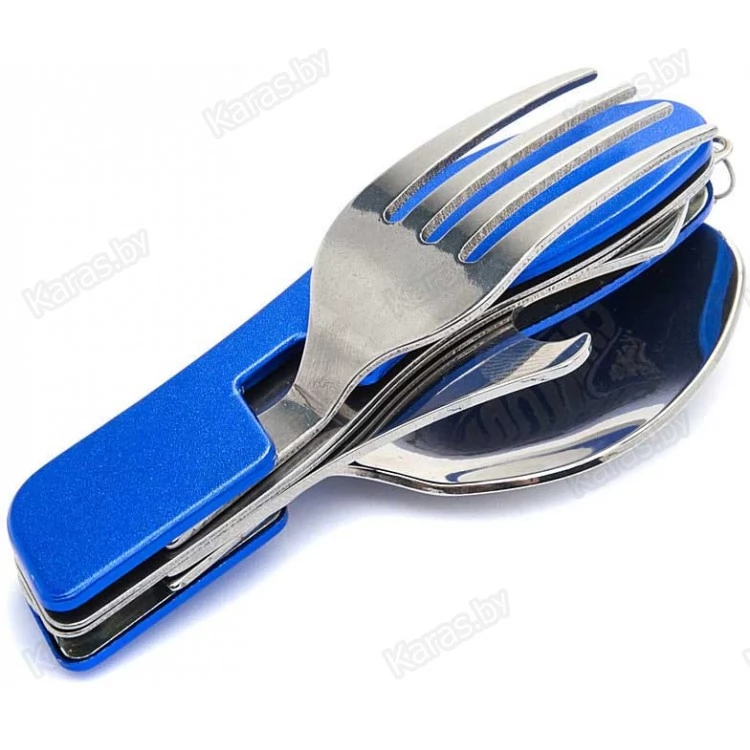 Походный набор столовых приборов Следопыт PF CWS P53 из пищевой нержавеющей стали, в чехле. В наборе есть ложка с ножом-открывашкой и вилка, петля для подвешивания. Набор удобно складывается в чехол с застежкой на липучке. На чехле есть петля для ношения на ремне. Компактный, удобный, практичный.