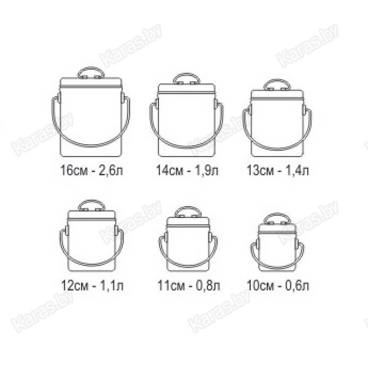| Объём, л | 0,6; 0,8; 1,1; 1,4; 1,9; 2,6 |