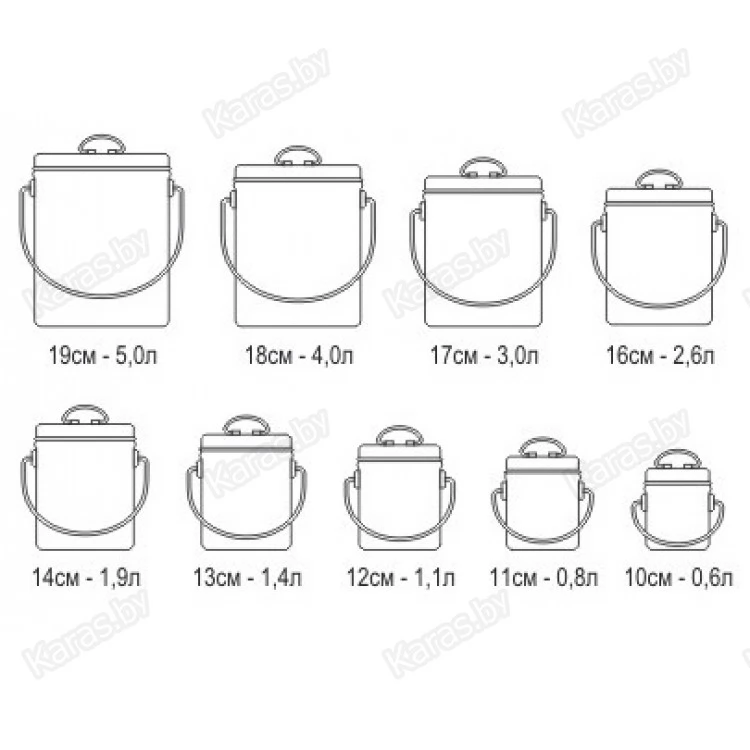 Объем (л): 0.6, 0.8, 1.1, 1.4, 1.9, 2.6, 3.0, 4.0, 5.0