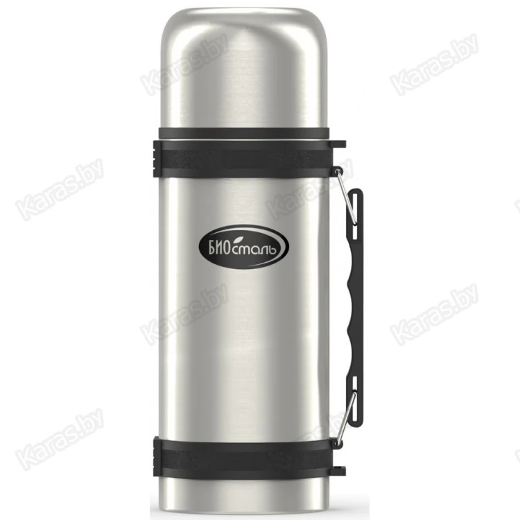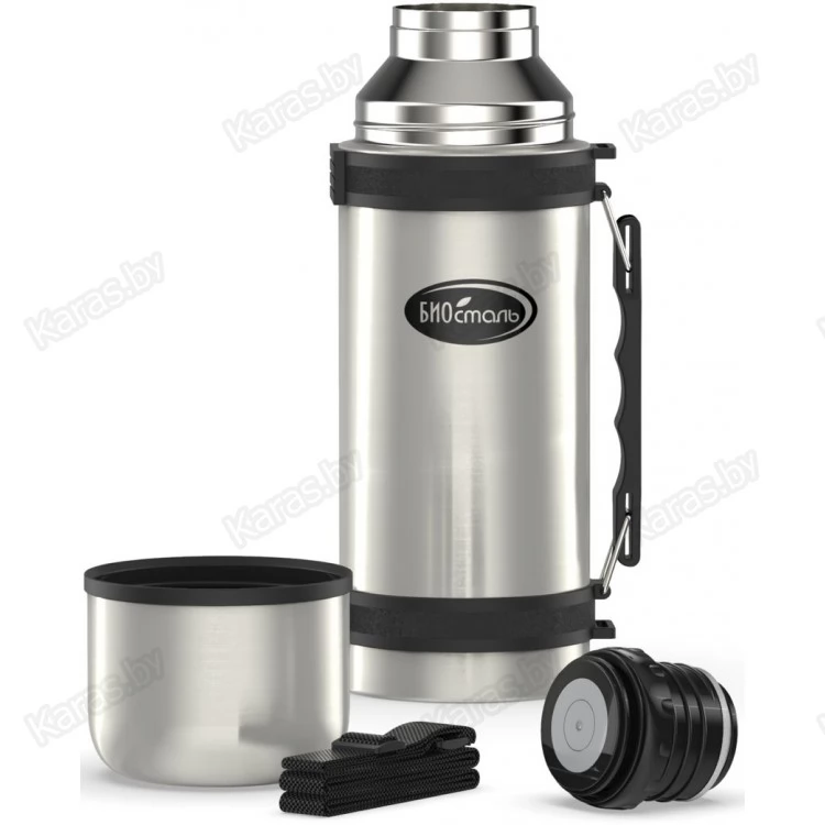 Термос большого объёма с боковой ручкой на корпусе и регулируемым по длине ремешком для переноски. Термос имеет пробку с кнопкой, благодаря которой, можно наливать напиток не откручивая пробку. Термос изготовлен из высококачественной нержавеющей стали 18/8 (AISI 304).