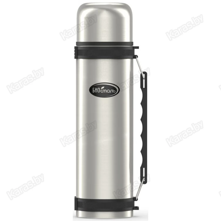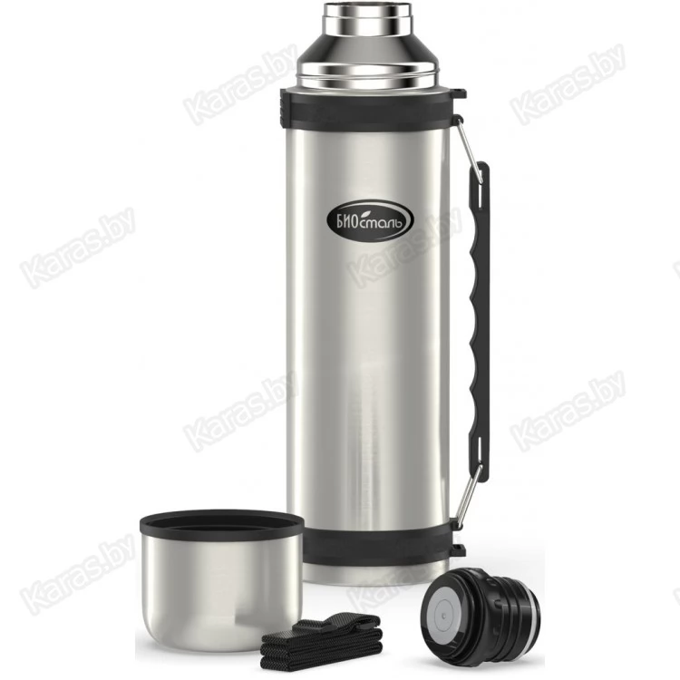 Термос большого объёма с боковой ручкой на корпусе и регулируемым по длине ремешком для переноски. Термос имеет пробку с кнопкой, благодаря которой, можно наливать напиток не откручивая пробку. Термос изготовлен из высококачественной нержавеющей стали 18/8 (AISI 304).
