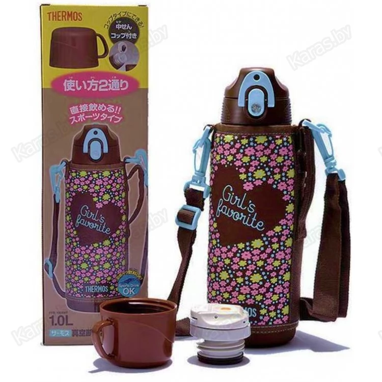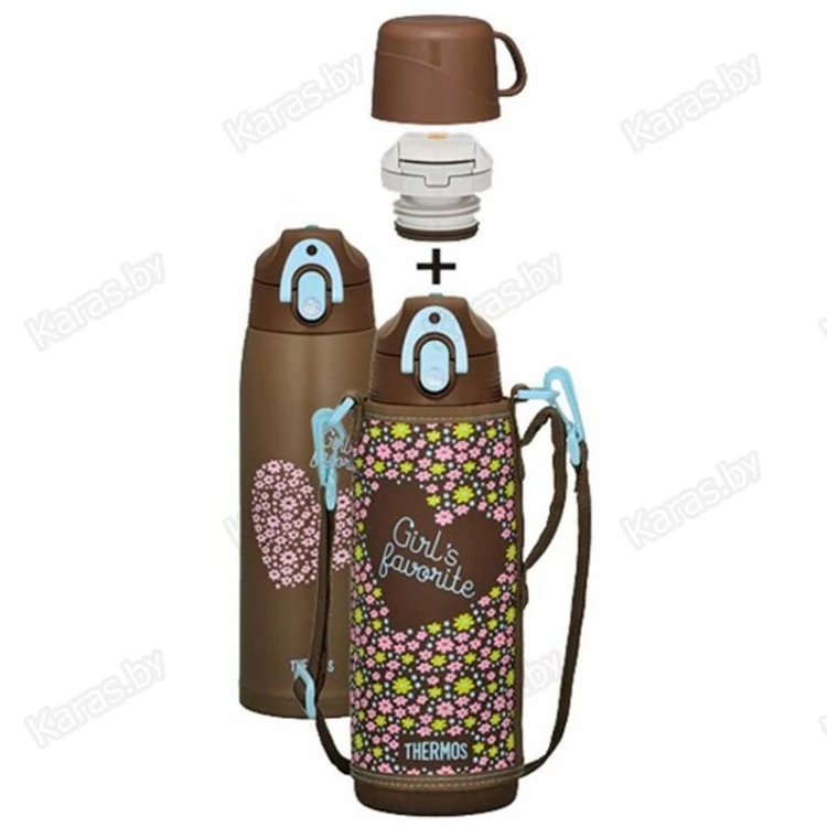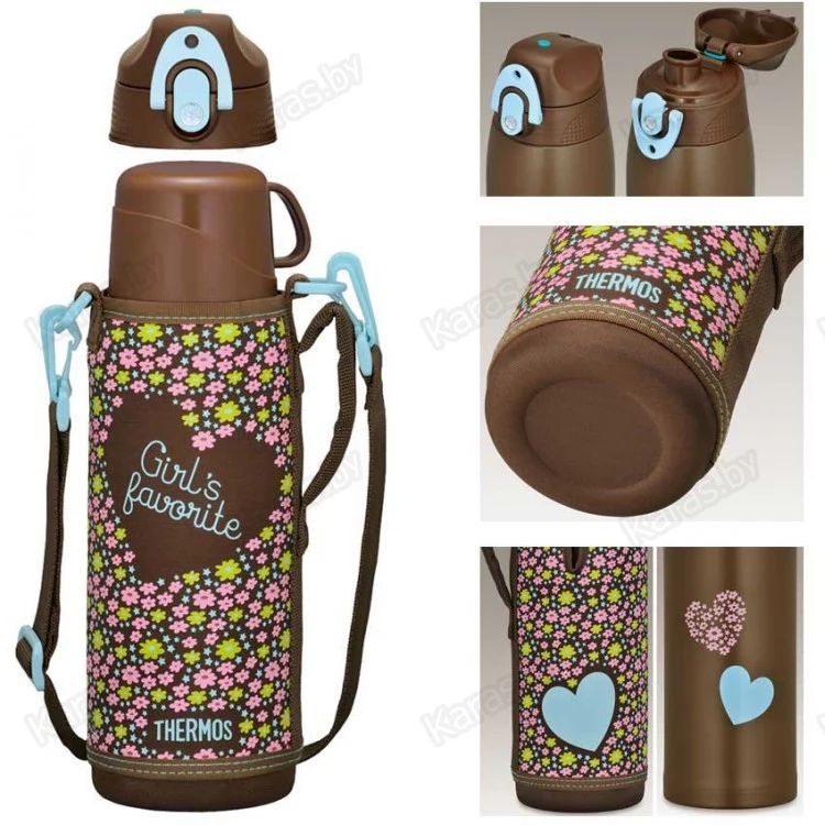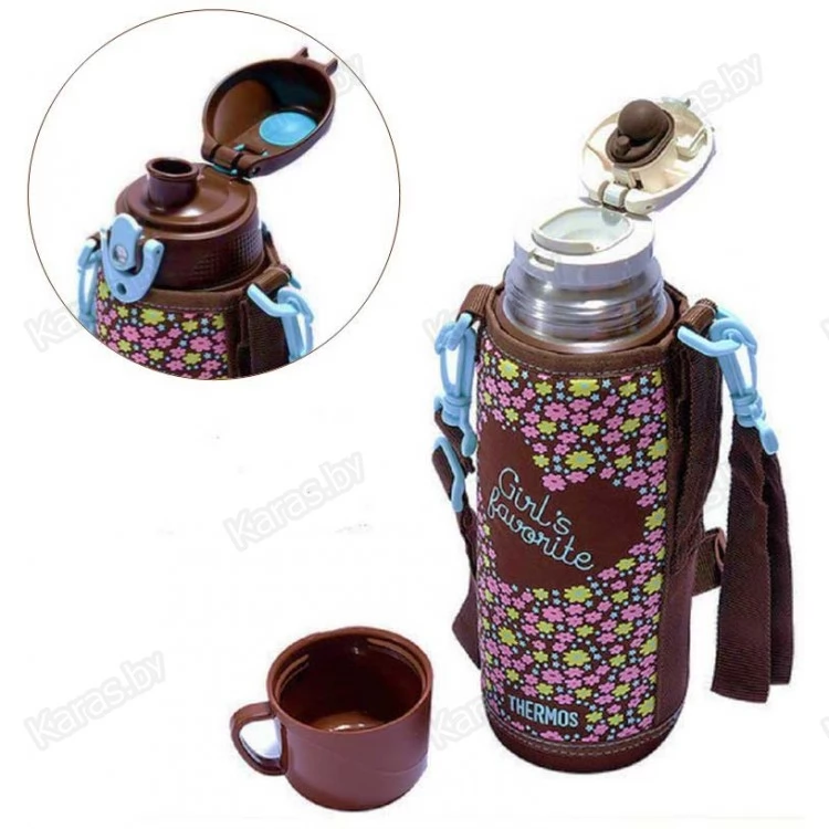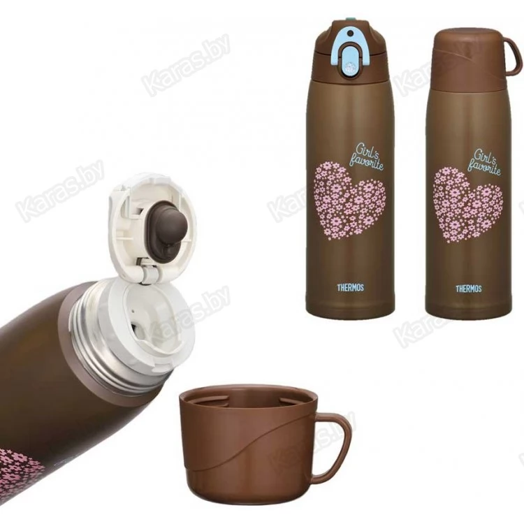 Для горячих жидкостей предусмотрена пробка с откидной крышкой, дополнительная верхняя крышка служит чашкой. Оригинальная конструкция крышки-пробки позволяет пить из термоса даже на ходу – удобный поильник с небольшим выливным отверстием предотвратит расплескивание напитка при движении. Крышка автоматически откидывается при нажатии на кнопку, расположенной на верхней части крышки, и фиксируется в открытом положении.