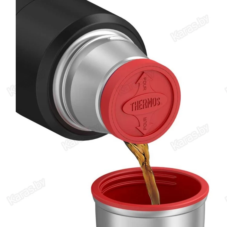 Термоизолирующие свойства термоса усиливает глубокая винтовая пробка, в конструкции которой предусмотрены специальные пазы для выливания напитка, что позволяет не выкручивать пробку полностью и тем самым снизить воздействие температуры окружающей среды. Крышку можно использовать как чашку.