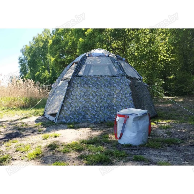 Стенки шатра оснащены огромными дверными и оконными проемами, образуя круговую систему вентиляции, благодаря чему пользователям обеспечен комфортный отдых в жаркое время года. Противомоскитные сетки на окнах и дверях и водостойкая ткань тента позволяют применять укрытие для ночлега на природе, защищая отдыхающих от насекомых и дождя. Легкая конструкция палатки позволяет переносить ее на дальние расстояния, что очень удобно для пеших походов, рыбалки или водного туризма.