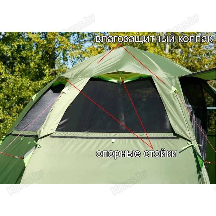 Палатка оснащена каркасом, который характеризуется огромным запасом прочности, практически исключающим возможные поломки даже при неправильном раскрытии палатки или при экстремальных погодных условиях.