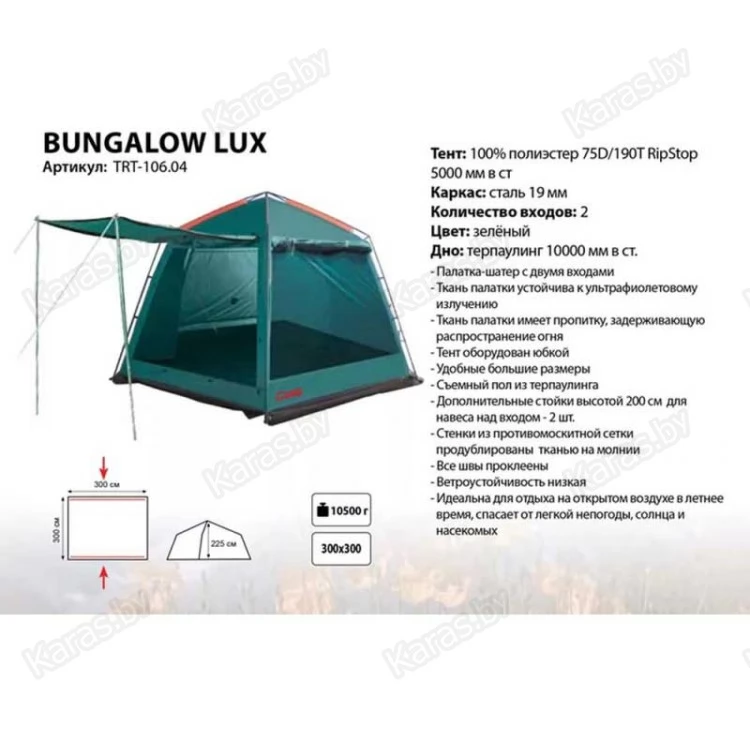 Tramp Bungalow Lux (v2) представляет собой четырехгранный кемпинговый тент-шатер на прочном стальном каркасе. Если вам в походе необходимо где-то разместить столовую кухню или кают-компанию для сбора обитателей туритического лагеря, данная модель – идеальный вариант.