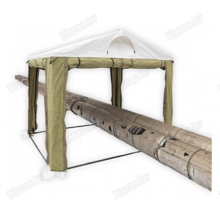 Основой укрытия служит легкий, легкомонтируемый металлический каркас. Тент укрытия выполнен из брезентовой ткани с огнеупорной пропиткой. Крыша изготовлена из непромокаемой ПВХ ткани плотностью 630 гр/м2. Различные конфигурации палаток и укрытий позволяют адаптировать их для использования в сложных промышленных и пространственных условиях.