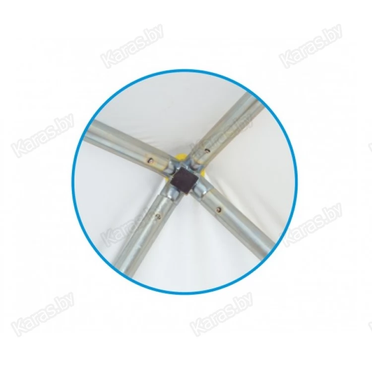 Каркас изготавливается из стальной трубы Ø 40 мм.с гальваническим покрытием. Имеет нижнее основание и верхнюю обвязку. Элементы каркасы крепятся между собой при помощи болтового соединения и кнопочных фиксаторов. Тент изготавливается из прочной армированной водонепроницаемой ткани с двухсторонним ПВХ покрытием плотностью 550 гр.м2